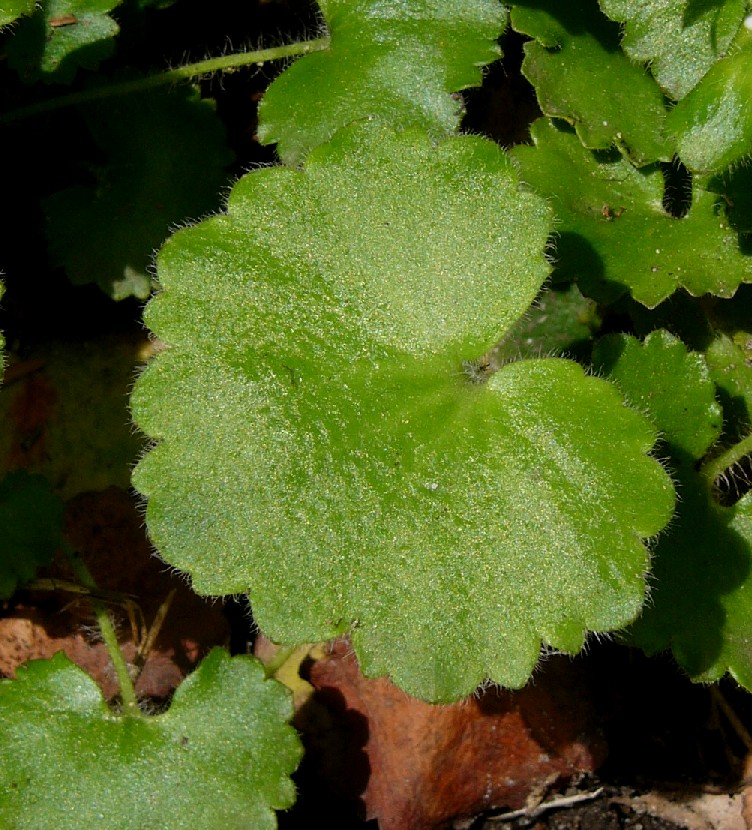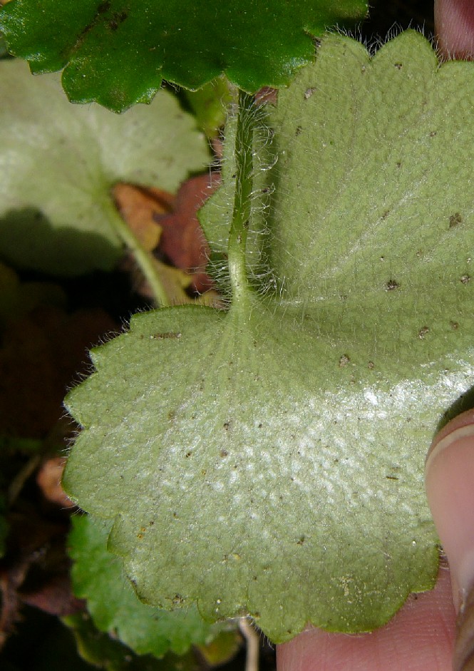 Grundblätter oft breiter als lang, am Grund herzförmig, gezähnt, weich, nicht ledrig