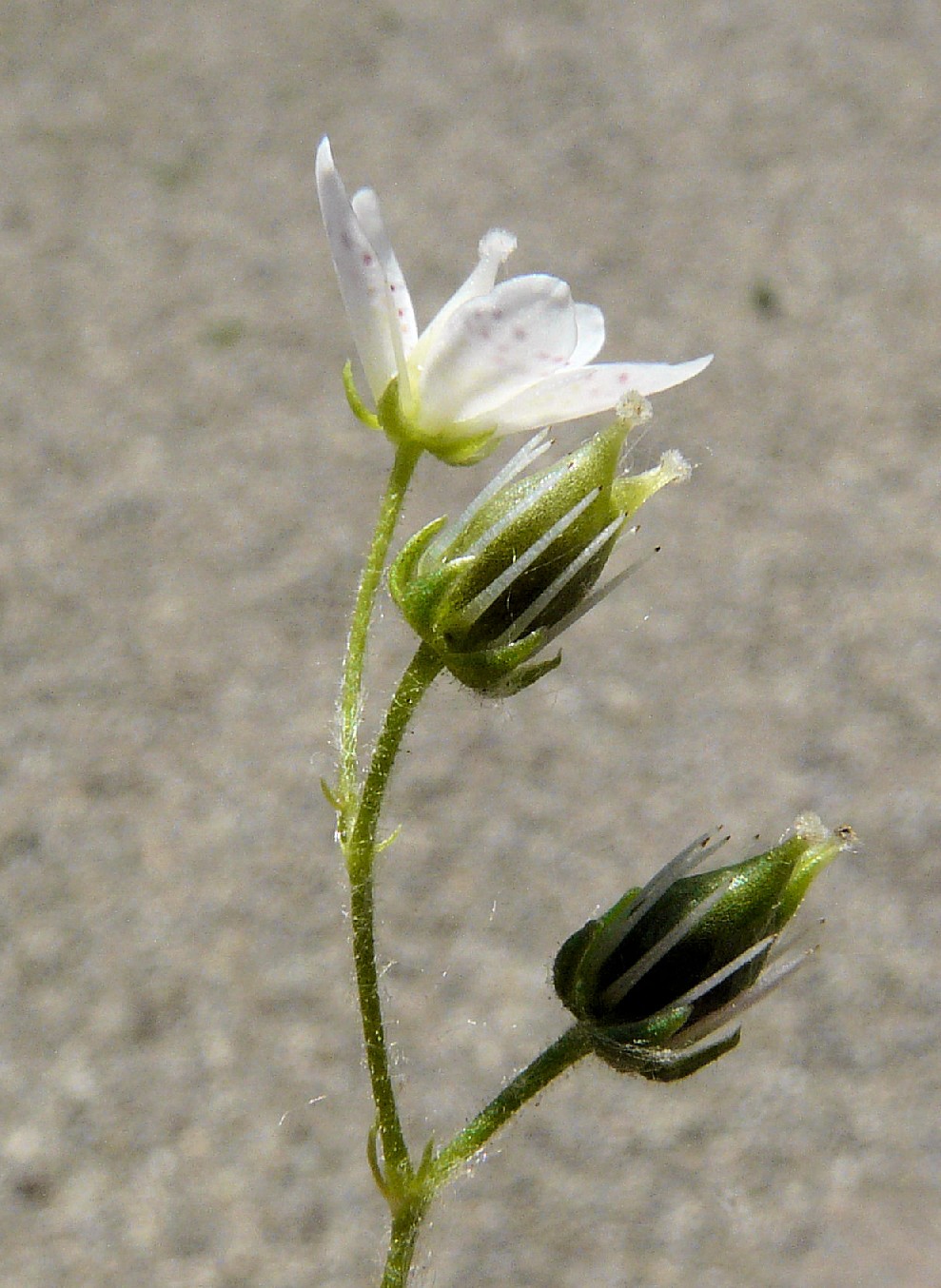 Kronblätter 5 - 9 mm langweiß, mit roten und am Grund mit gelben Punkten