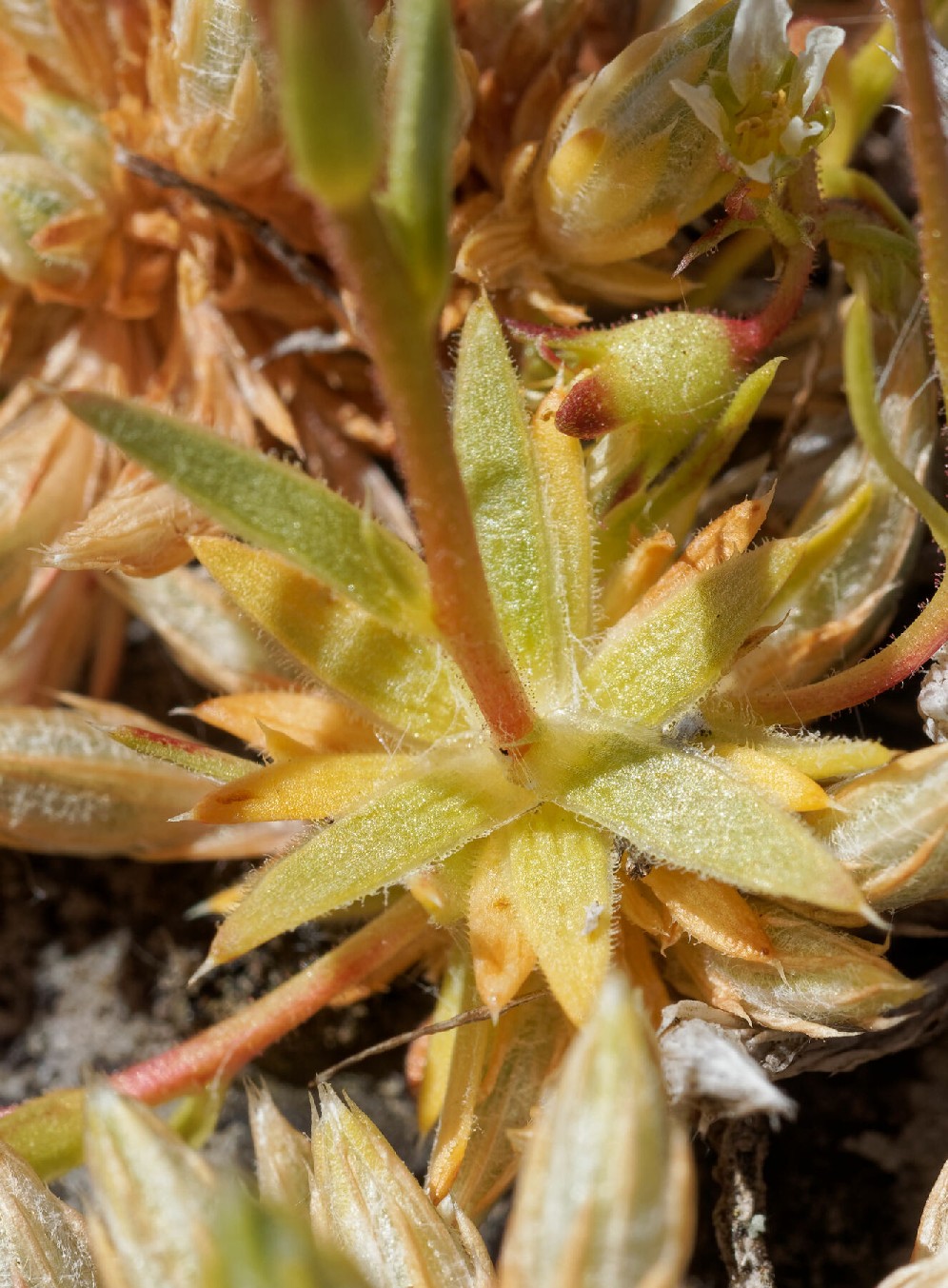 Grundblätter rosettig, 3 - 7 mm lang, 1 mm breit, linealisch- lanzettlich, ganzrandig, , ungestielt, am Rand bewimpert, vorne mit aufgesetztem häutigem Spitzchen