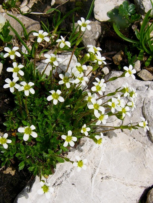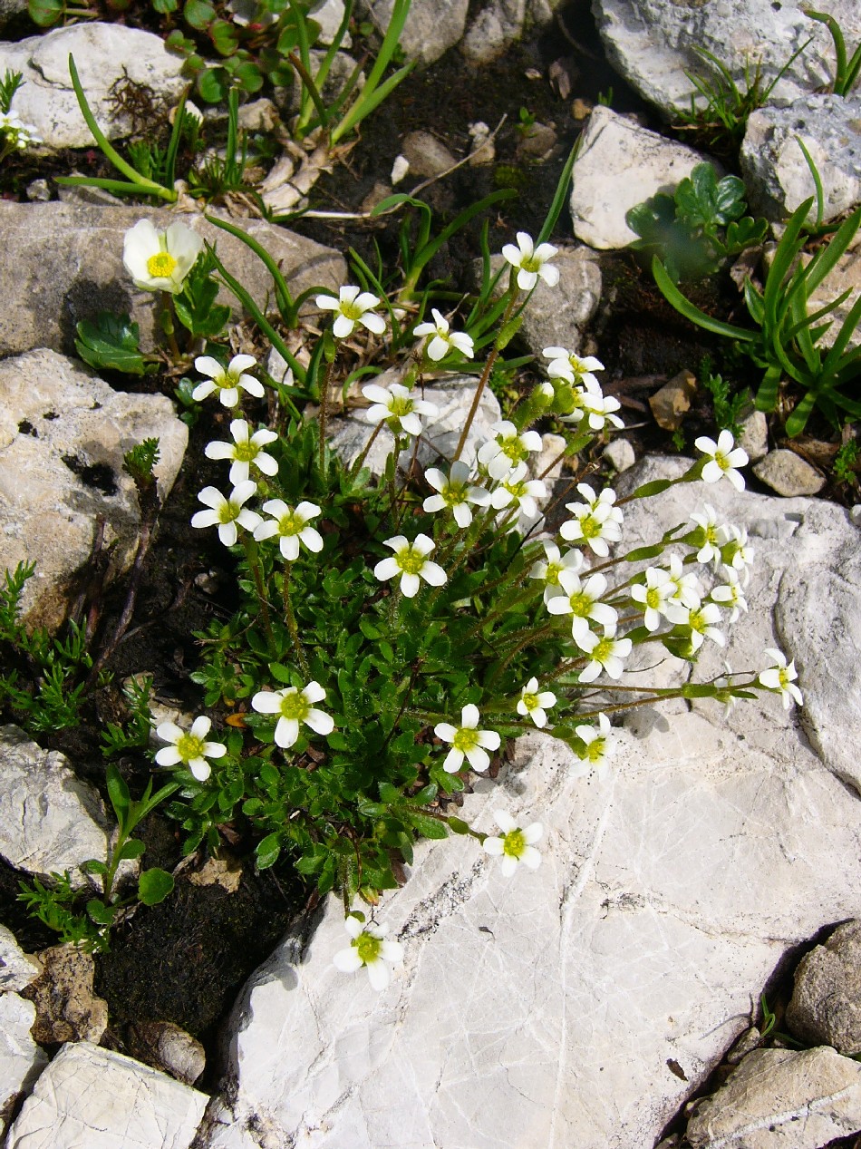 Saxifraga - Blüten weiß, ohne Punkte, Blätter weich, nicht kalkausscheidend, eilanzettlich, vorne stumpf