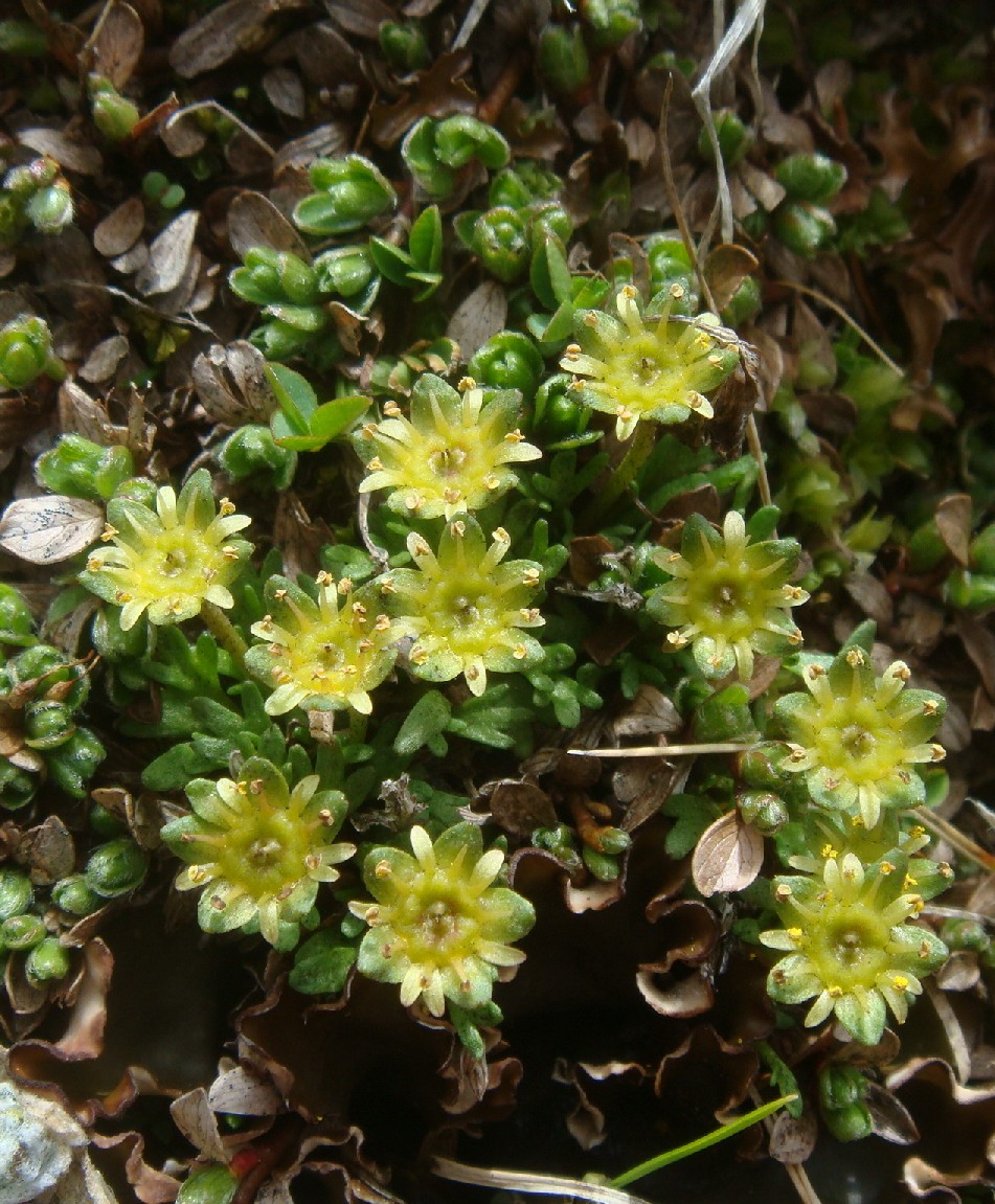 Kronblätter dottergelb, 2 - 3 mm lang, schmaler als die Kelchblätter, einander nicht berührend, Fruchtknoten unterständig, Nektarscheibe grün, Kelchblätter grün stumpf
