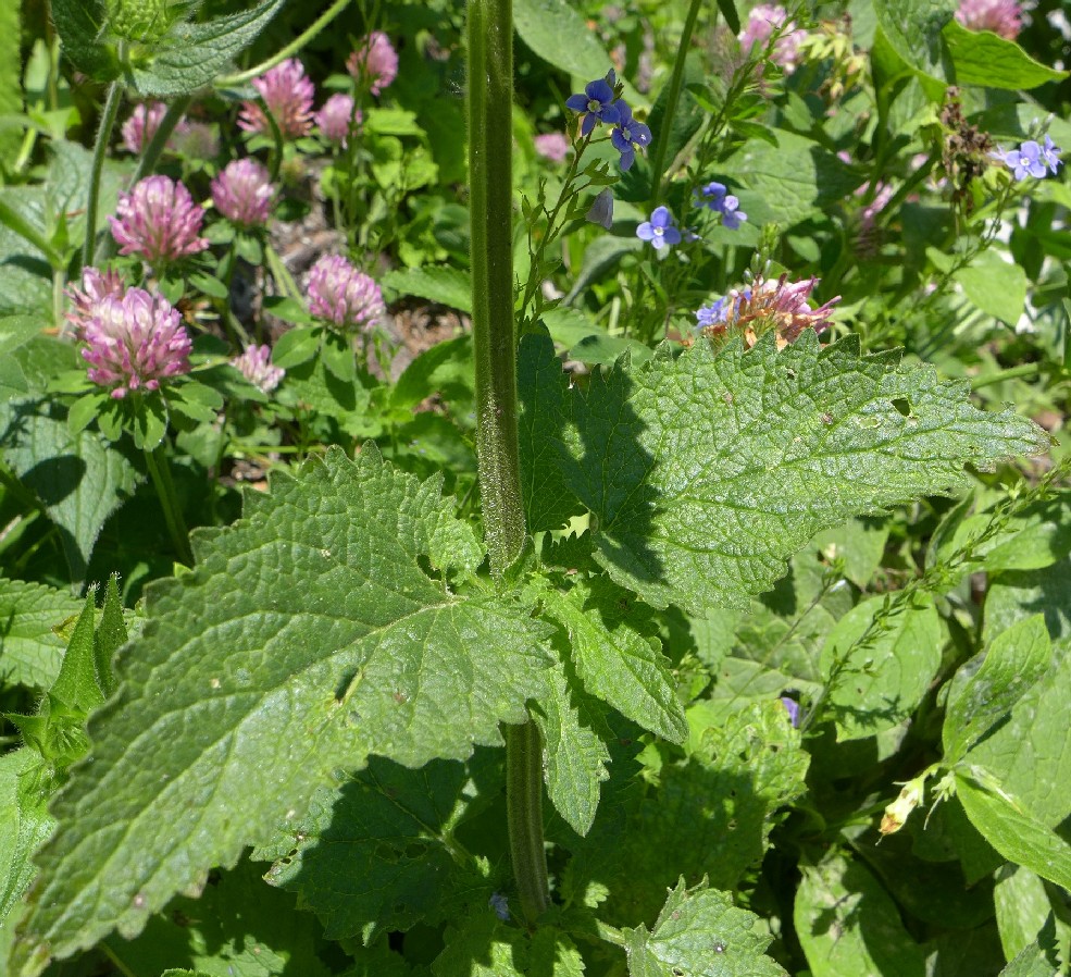 Blätter gegenständig, max. 9 cm lang, eiförmig, am Grund abgerundet bis schwach herzförmig, zumindest auf den Adern flaumhaarig, kerbzähnig