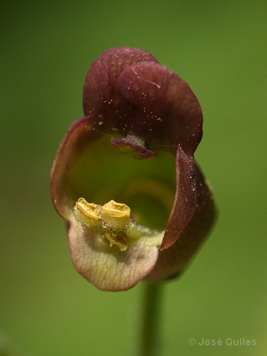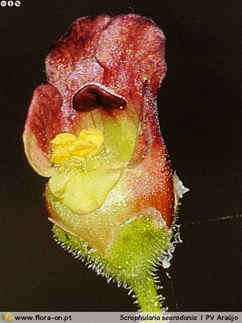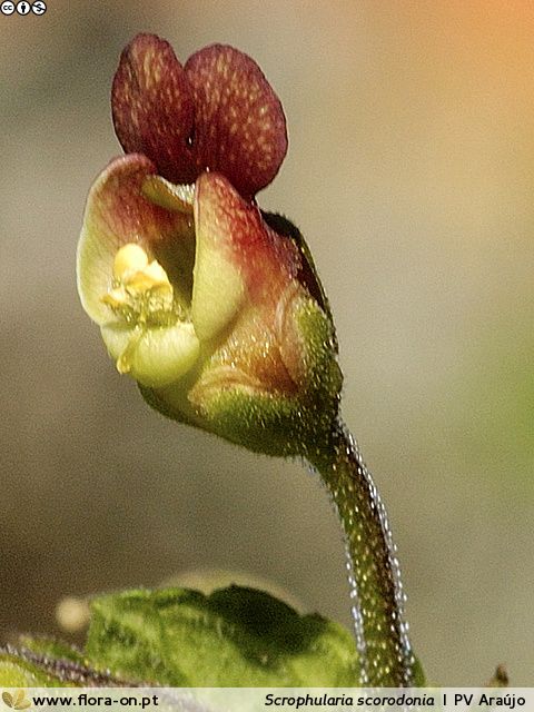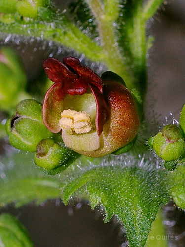 Blüten 7 - 9 mm lang, Kronröhre bauchig, gelblich oder grünlichbraun, Kronoberlippe braunrot, Staubblätter nicht aus der Krone ragend