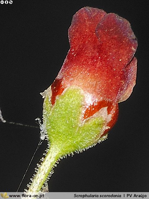 Blüten 7 - 8 mm lang, Kronröhre bauchig, gelblich oder grünlichbraun, Kronoberlippe dunkelrot, Staubblätter nicht aus der Krone ragend, Kelchzipfel oval, mit 0,2 - 0,6 mm breitem Hautrand, zumindest einige im unteren Teil mit Drüsenhaaren