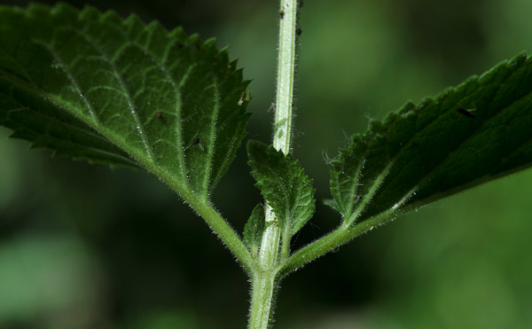 Tragblätter der Zymen blattähnlich, die unteren bis 14 cm lang, gesägt, herzförmig, drüsig behaart, die oberen deutlich kleiner und schmaler