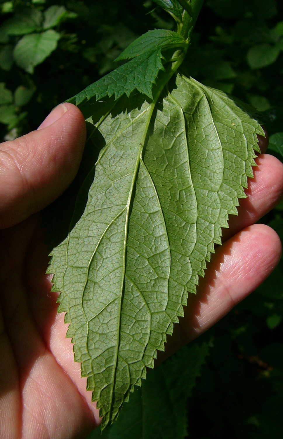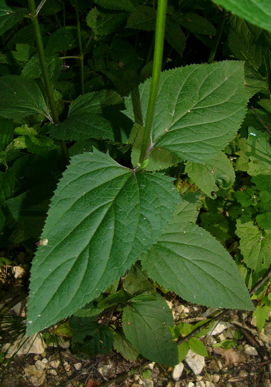 Stängel im unteren Teil scharf vierkantig, ungeflügelt, kahl oder schwach drüsig Blätter ei- herzförmig, gegenständig,