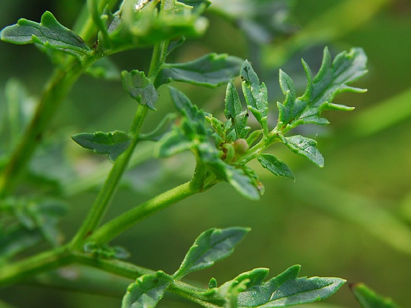 blütig, Blätter grün, dünn, nicht fleischig, Fiederabschnitte spitz, Adern deutlich > 2