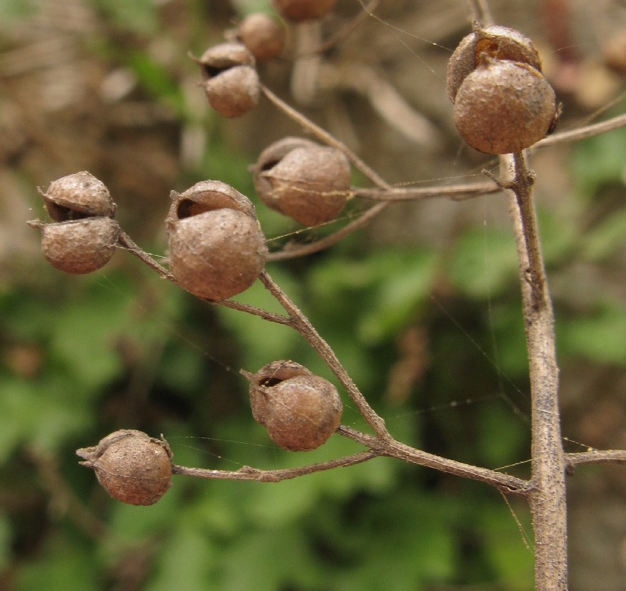 Blüten 5 - 9 mm lang, gestielt, Kronröhre gelbgrün oder bräunlich- grün, Kronlappen dunkelbraun, Staminodium breit, nierenförmig