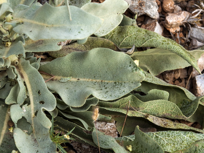 Stängel mit zahlreichen wechselständigen, herablaufenden Blättern, Blätter beiderseits weißfilzig, am Rand gewellt, Grundblätter 30 - 35 cm lang, 9 - 12 cm breit, rosettig