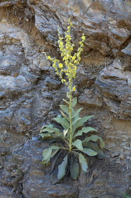 Grundblätter 10 - 35 cm lang, 3 - 12 cm breit, lanzettlich, +/- ganzrandig, spitz, beiderseits gelbfilzig, puderartig, Stiel 1 - 10 cm lang, geflügelt