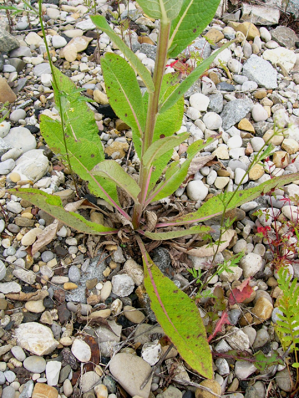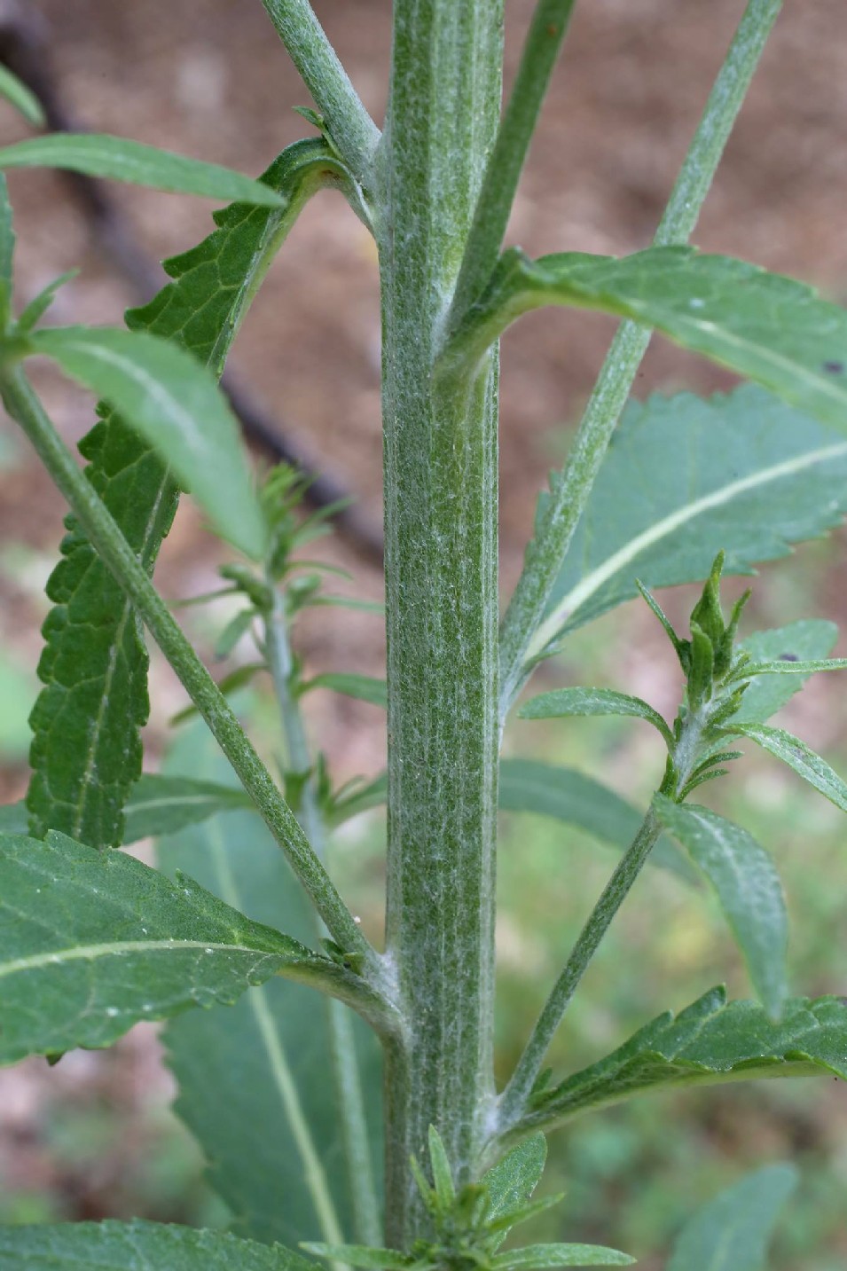 Stängel spärlich spinnwebig behaart, später verkahlend, Stängelblätter lanzettlich, deutlich gekerbt gesägt, nicht herablaufend, die oberen sitzend, die unteren gestielt