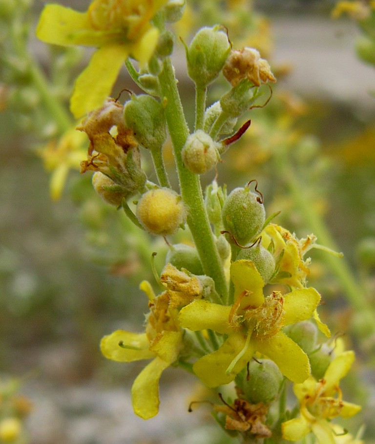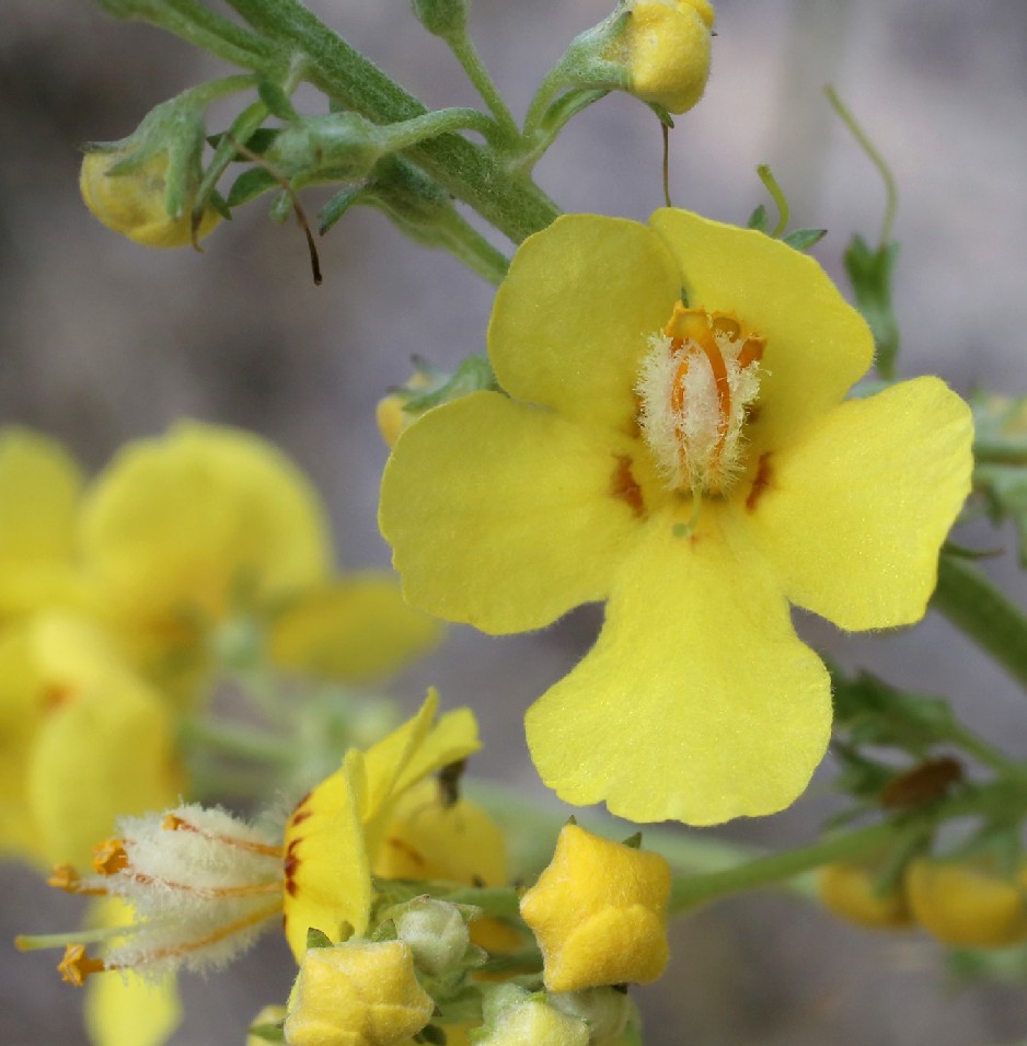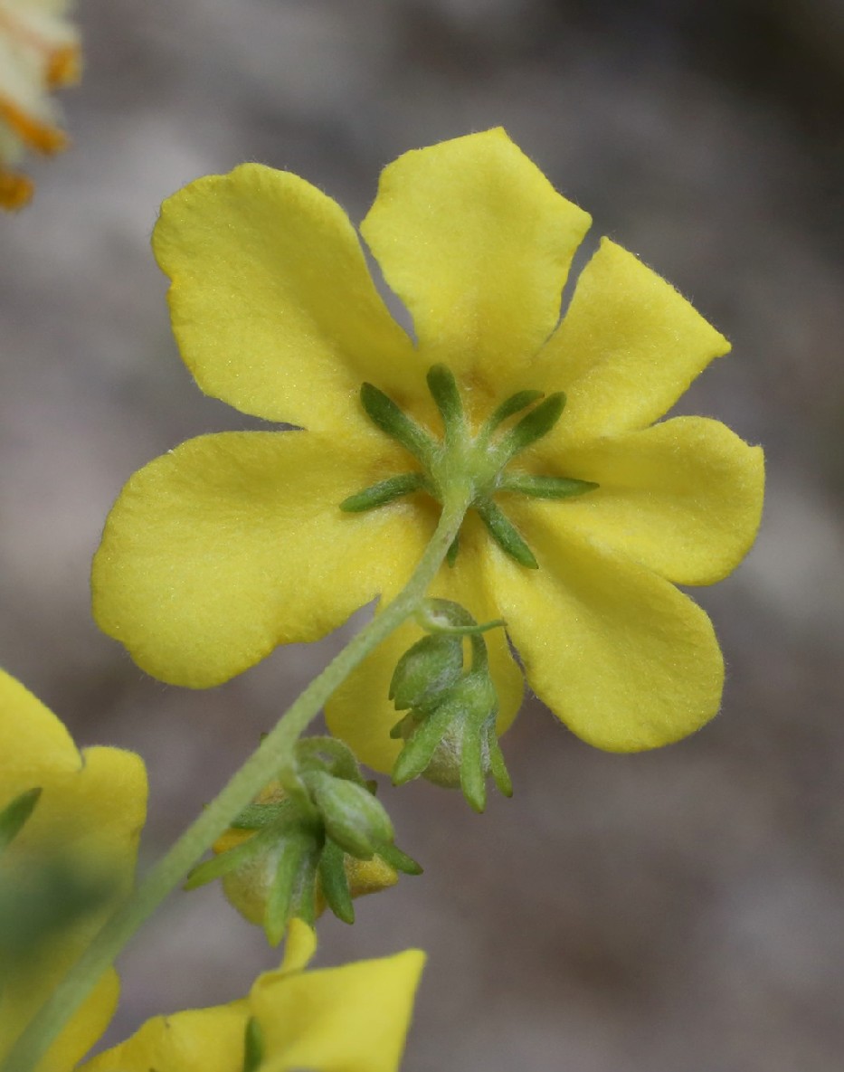 Blüten gelb, 18 - 20 mm im Durchmesser, außen kahl, mit zahlreichen durchscheinenden Drüsenpunkten, 5 Staubblätter, Staubfäden weiß- oder gelbwollig, Antheren alle quer nierenförmig, Griffel 6 - 7 mm, behaart, Narbe endständig, eikugelig