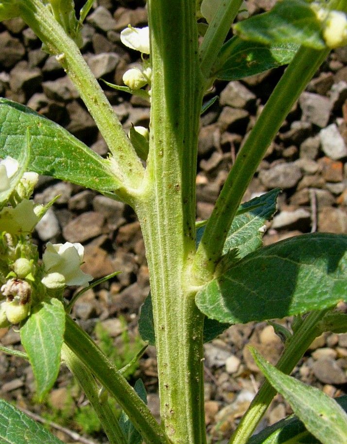 Stängel oben rippig kantig, fein angedrückt grauhaarig, drüsenlos