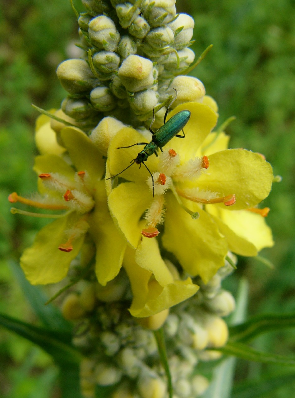 Blüten mit 5 Staubblätetrn, alle Staubfäden ca. gleich lang, bis zu den Antheren weißwollig, Antheren alle quer nierenförmig, Giffel 5 - 8 mm lang, Narbe kugelig