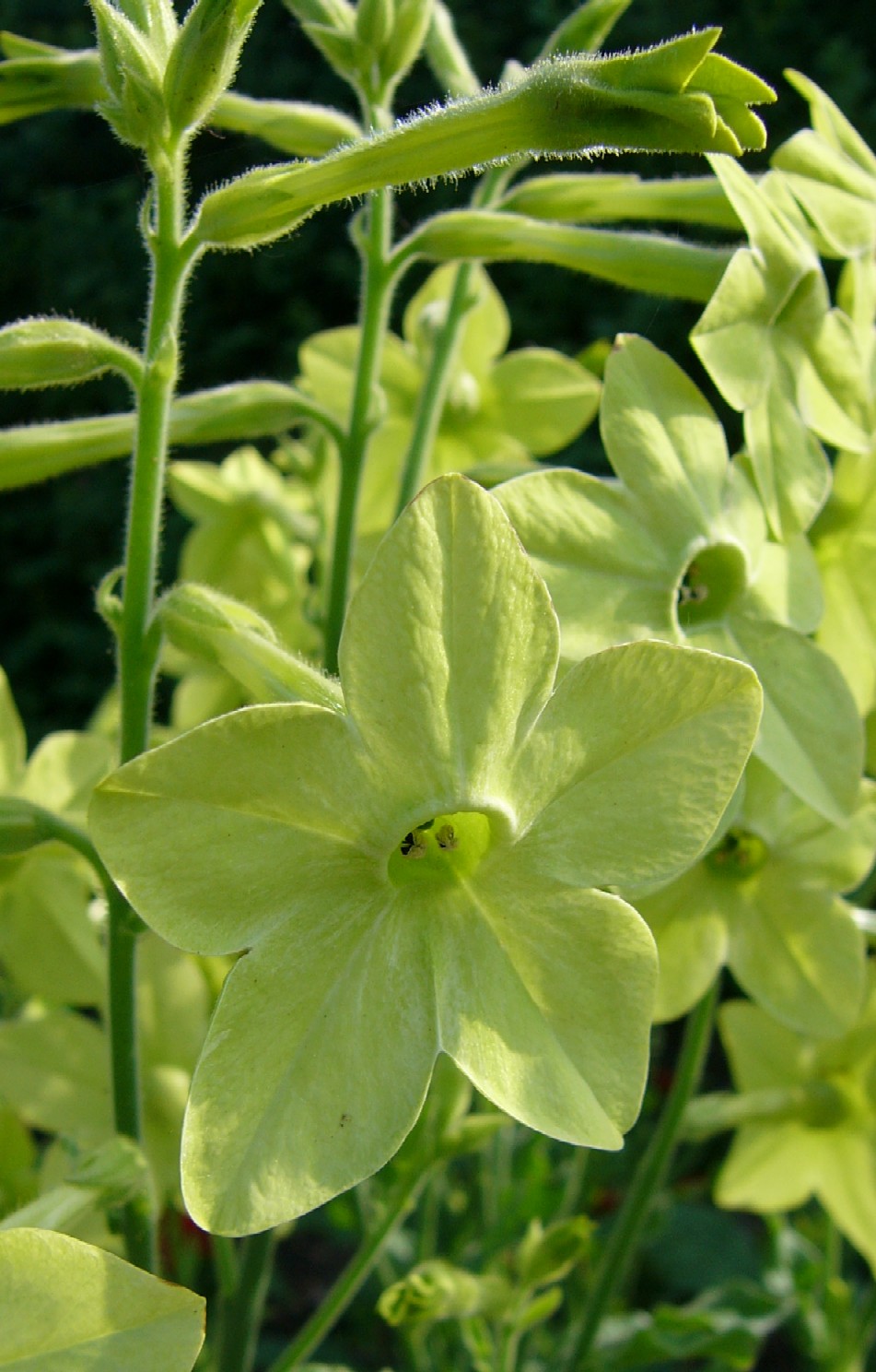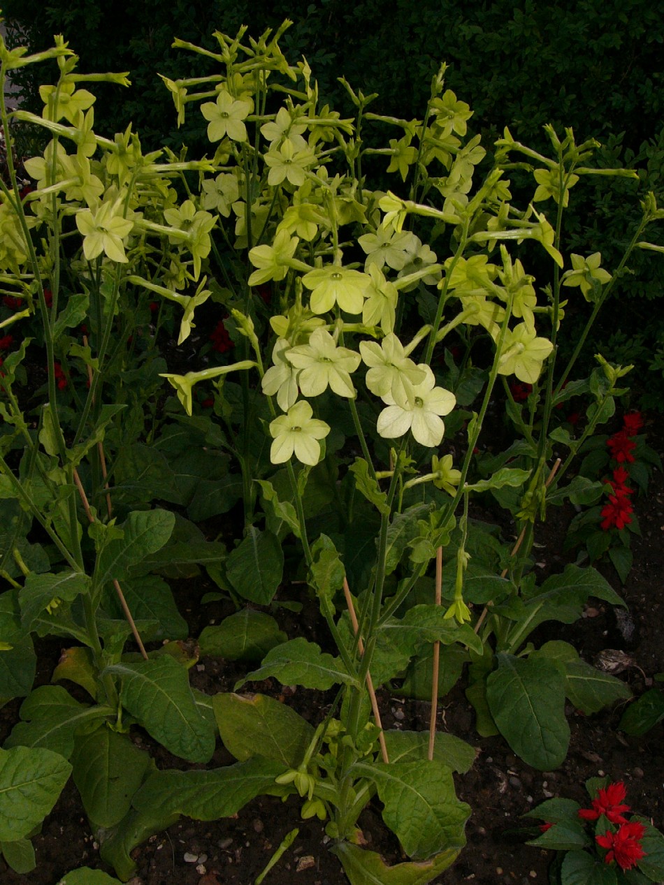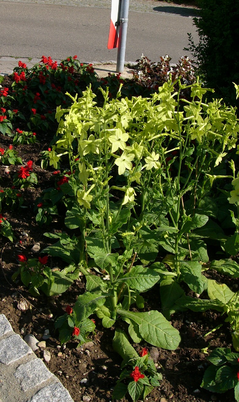 Nicotiana x sanderae W.Watson (Sander- Tabak) VI- IX, Zierpflanze, Ruderalstellen Entstanden aus Nicotiana forgetiana und Nicotiana alata. Synonyme: English name: Weltweite Verbreitung: Häufigster Ziertabak mit vielen