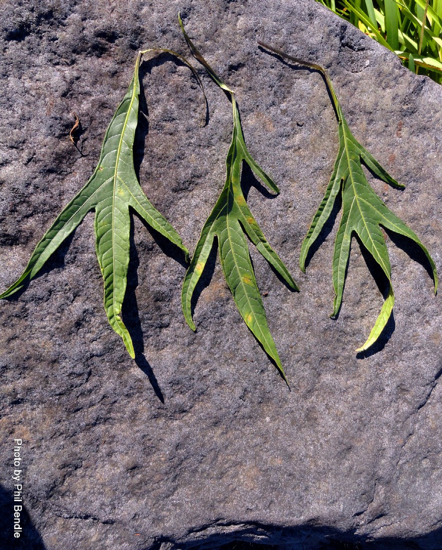 Blätter elliptisch, 15 - 30 cm lang, 10 - 15 cm breit, an derselben Pflanze sind einige Blätter ungeteilt und ganzrandig ,andere tief fiederschnittig, mit schmalen Fiederabschnitten