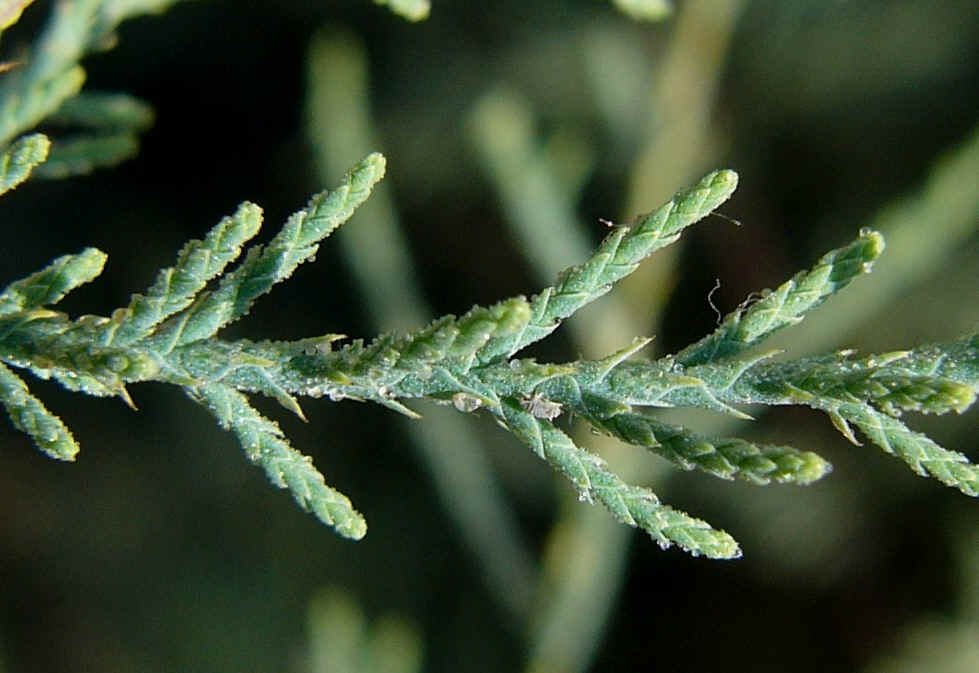 Blätter an jungen Zweigen dachziegelig, 1 - 3 mm lang, +/- gekielt, am Grund stängelumfassend, vorne spitz, Blattrand durchscheinend, mit oder ohne salzauscheidende Drüsen