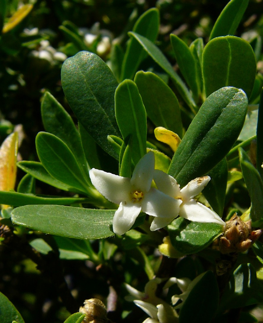 Endemit in Menorca Blätter dunkelgrün, glänzend mit umgerollten Rändern > Daphne rodriguezii
