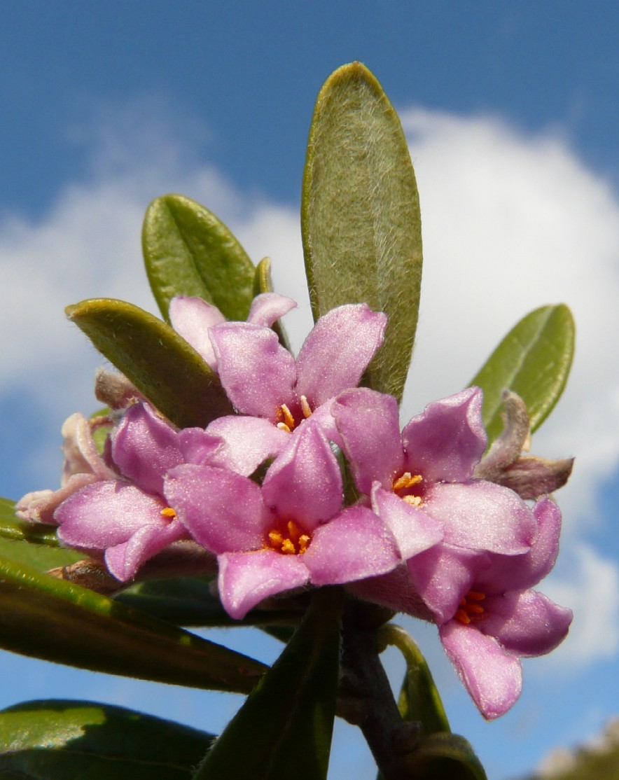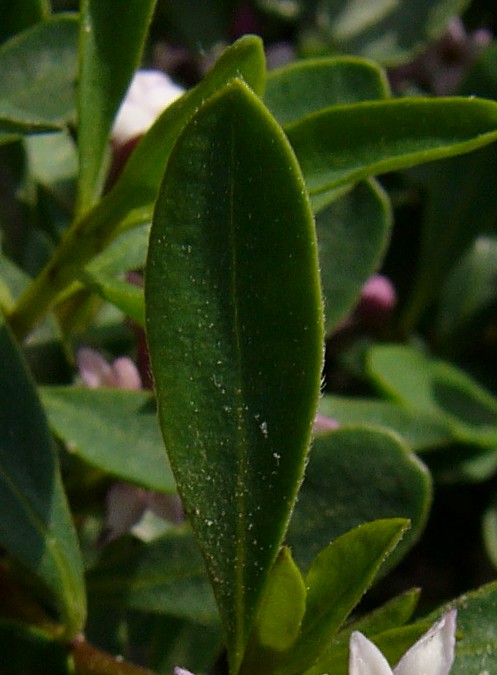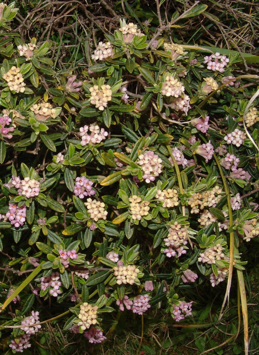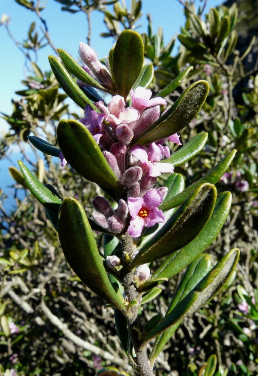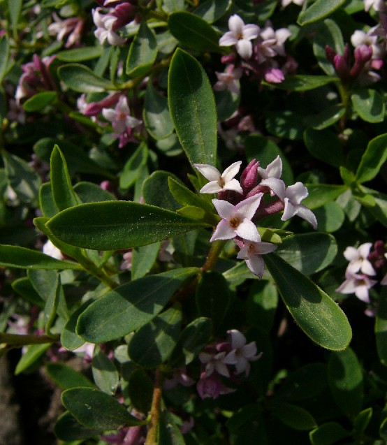 Daphne- Blüten rosa, Blätter 6 - 20 mm breit