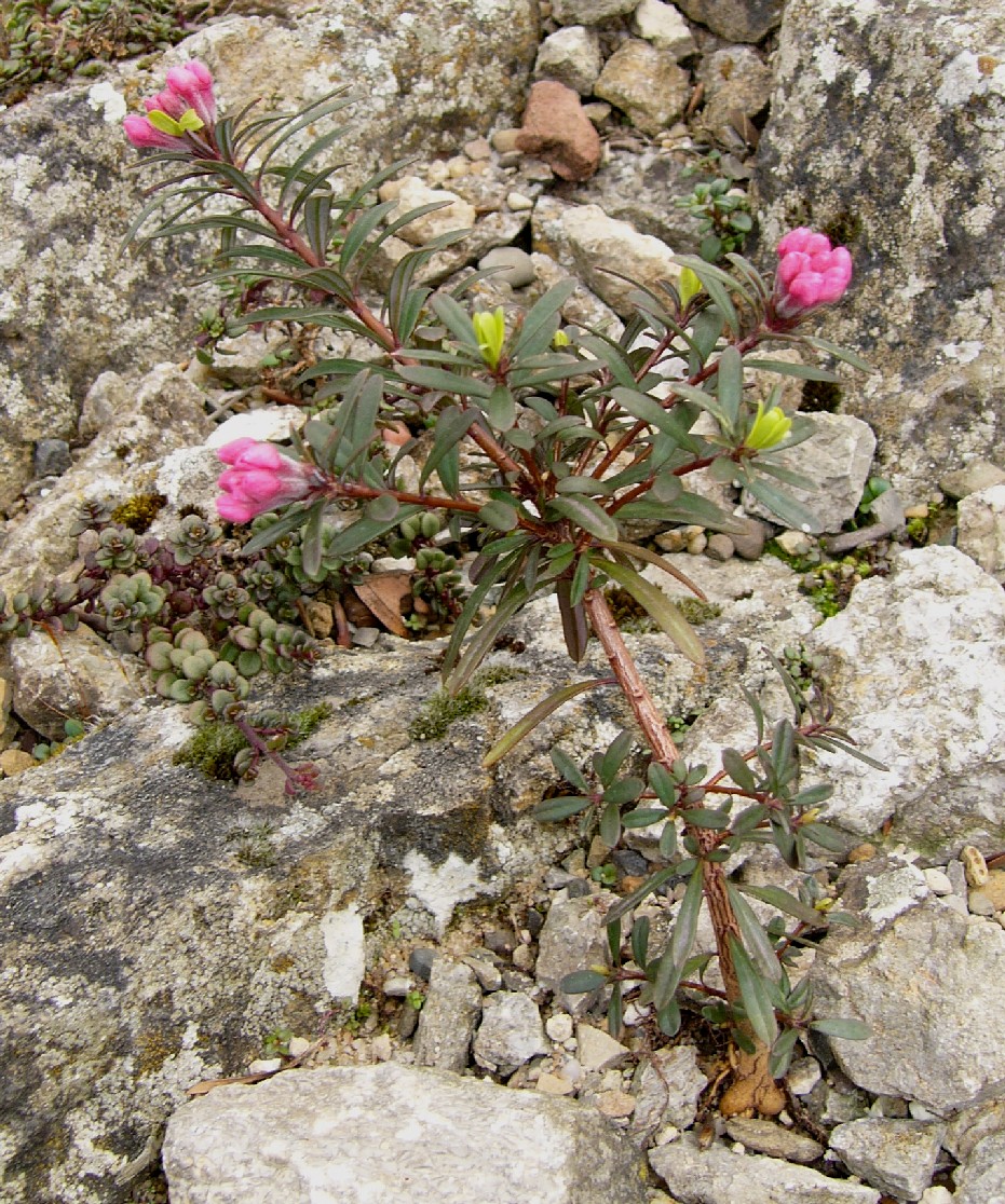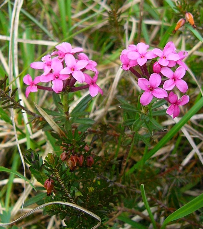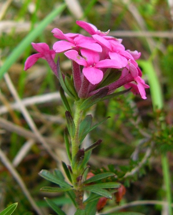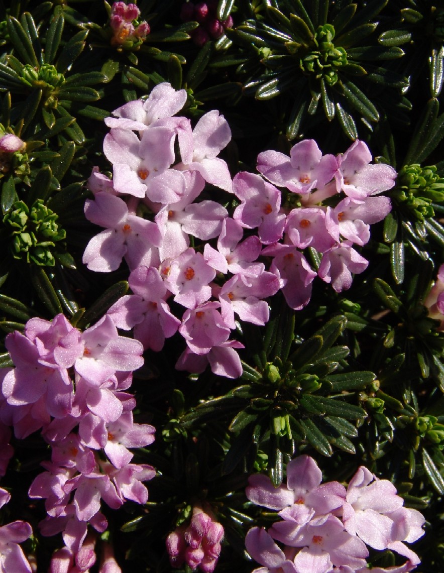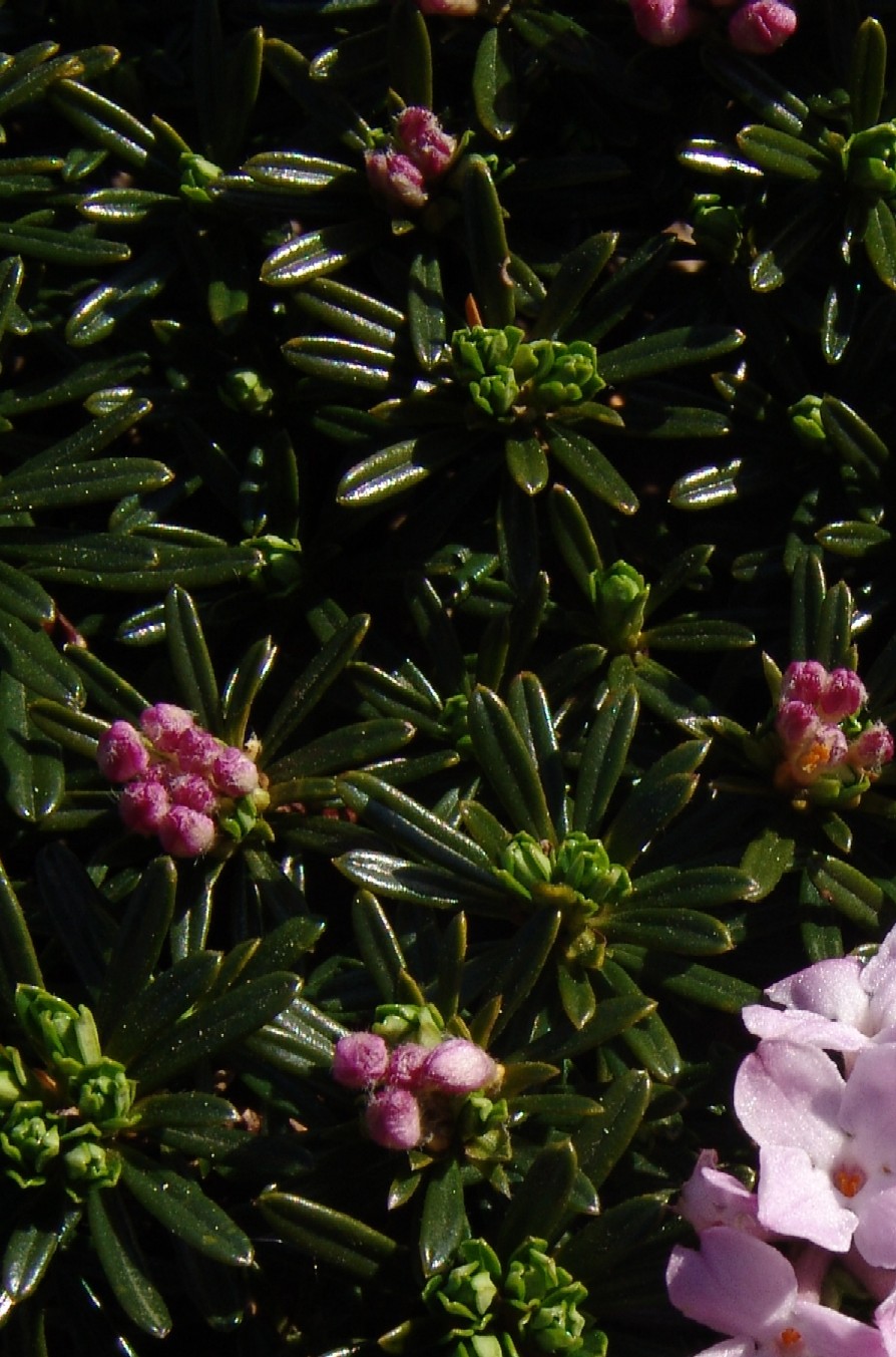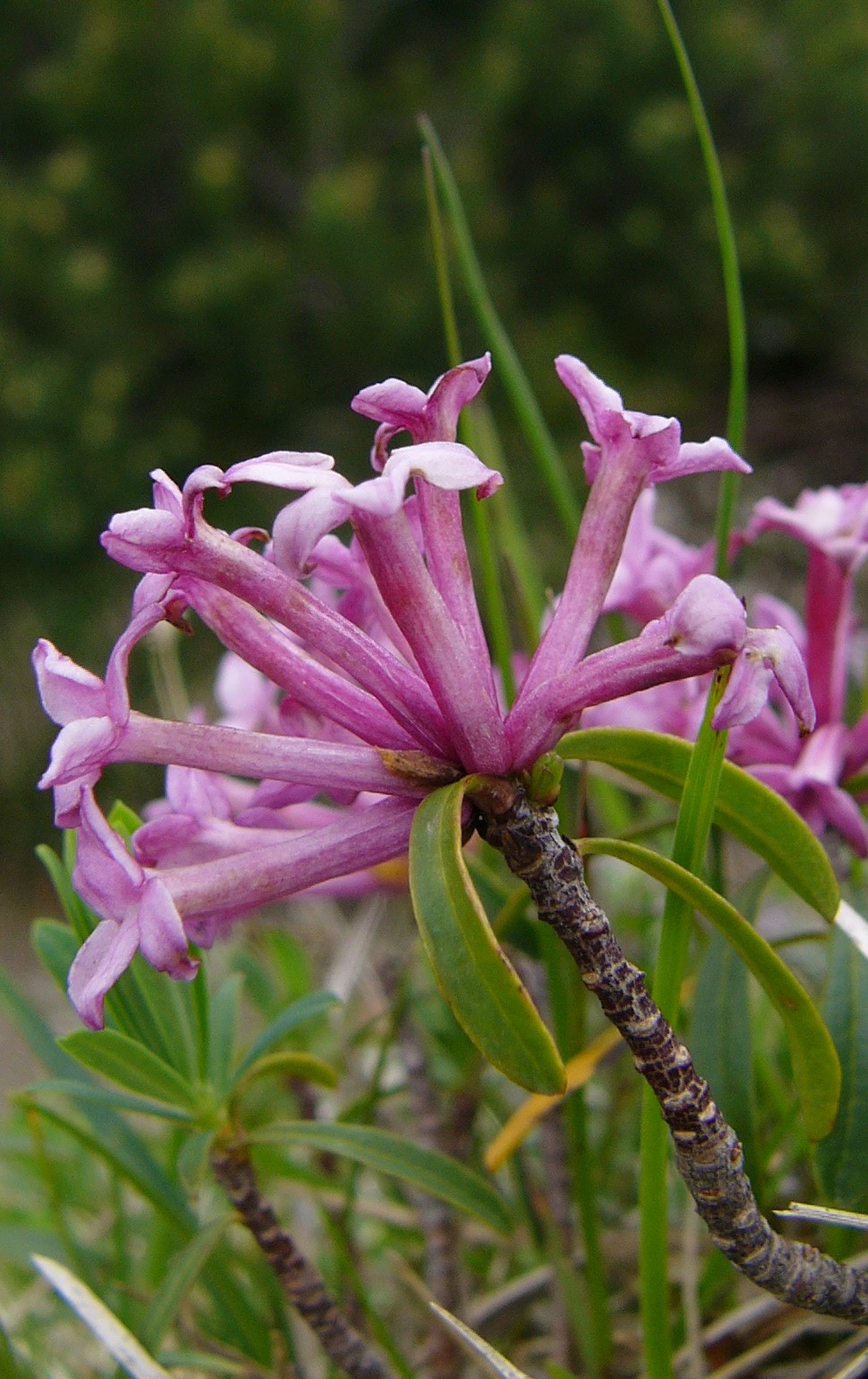 Daphne- Blüten rosa, Blätter 2 - 5 mm breit