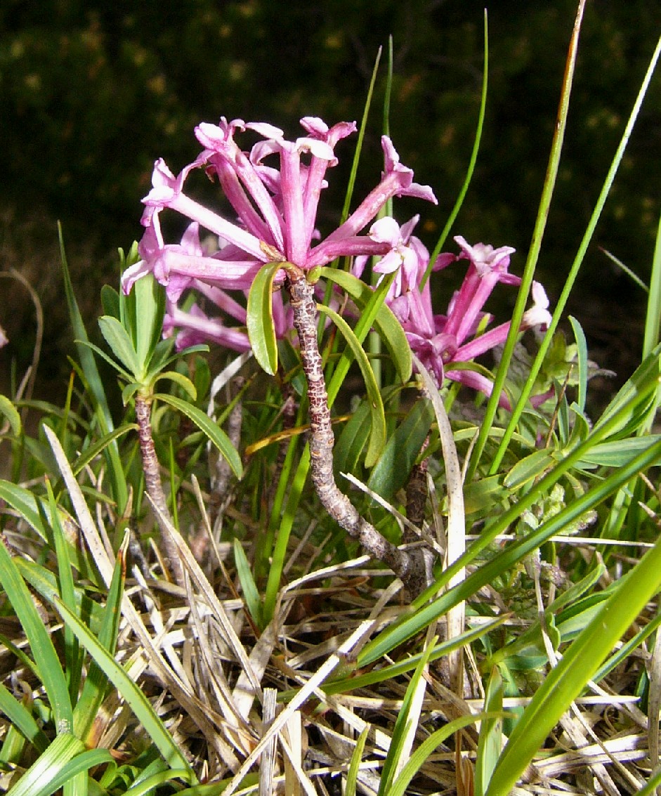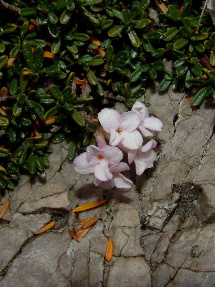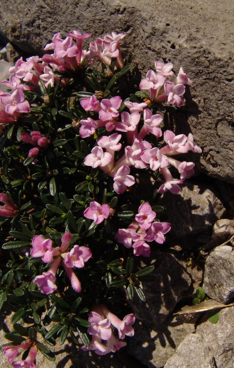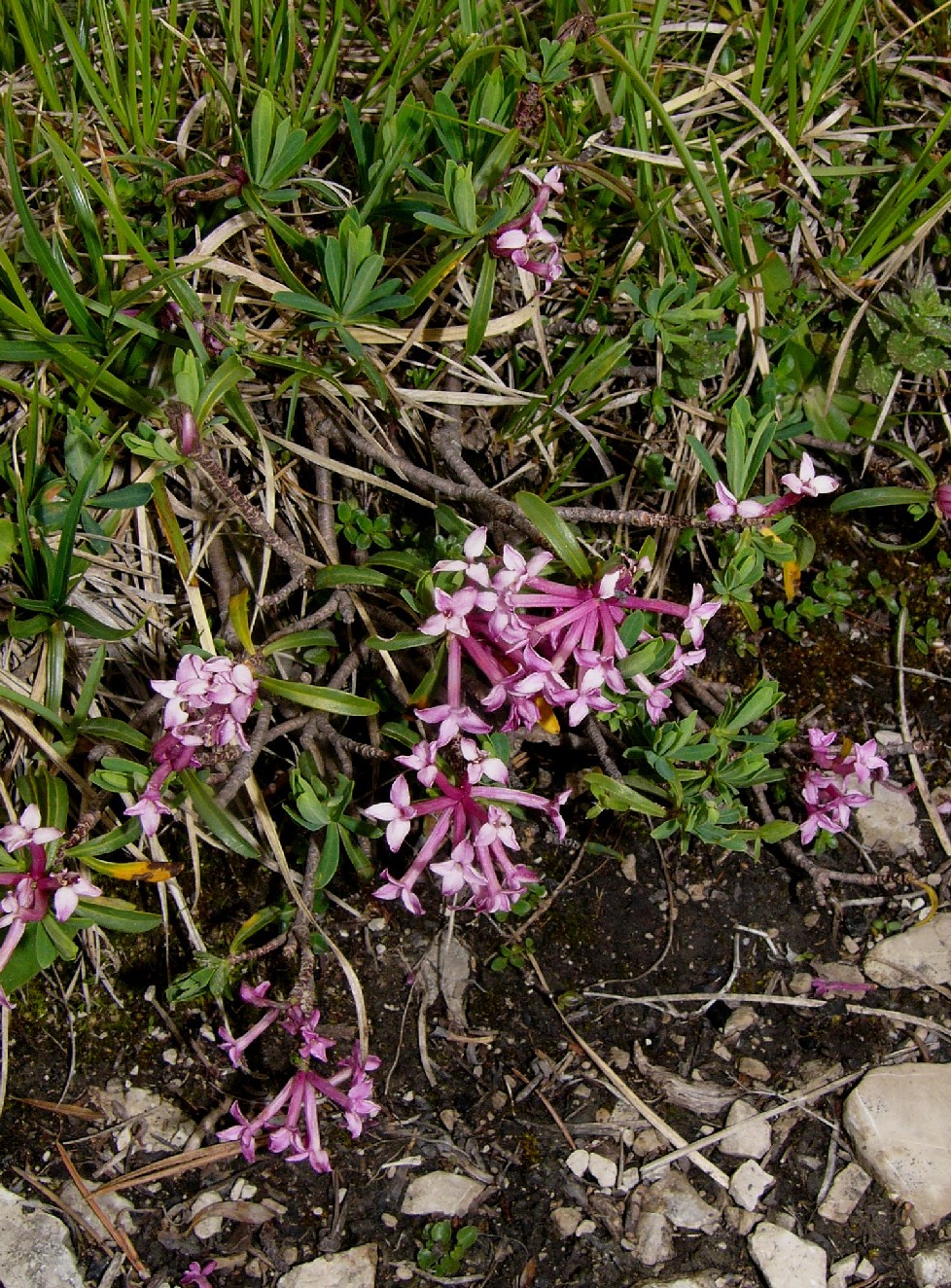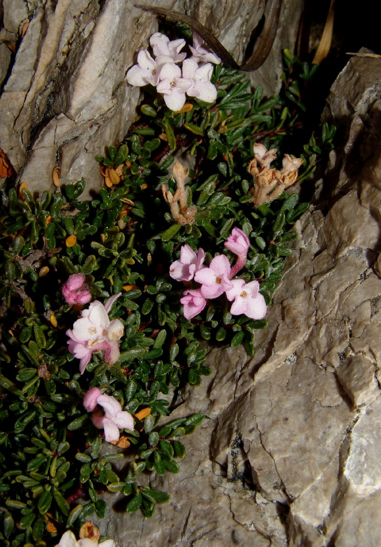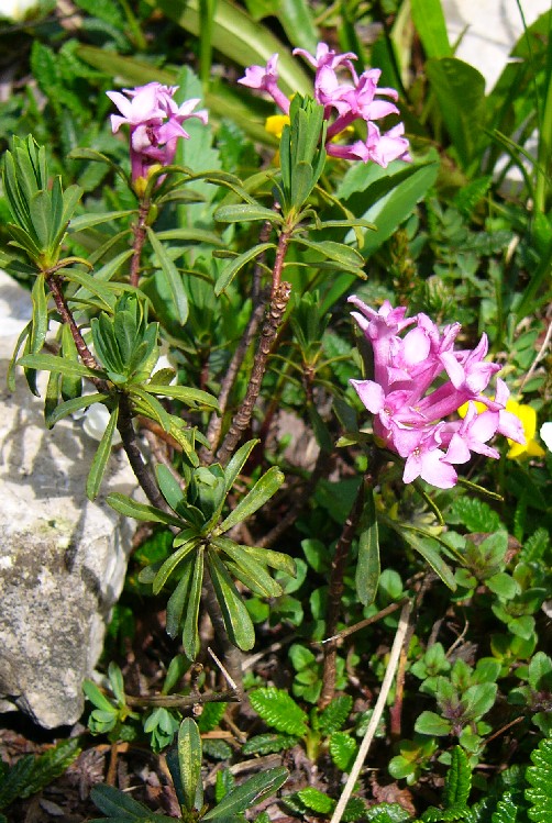 VII - VIII, Dolomitfelsen Synonyme: English name: Nome italiano: Weltweite Verbreitung: Etymologie: Bildet zusammen mit Daphne alpina den Bastard Daphne x reichsteinii und zusammen mit Daphne cneorum den Bastard Daphne x hendersonii Hodgkin ex C.D. Brickell & B. Mathew: