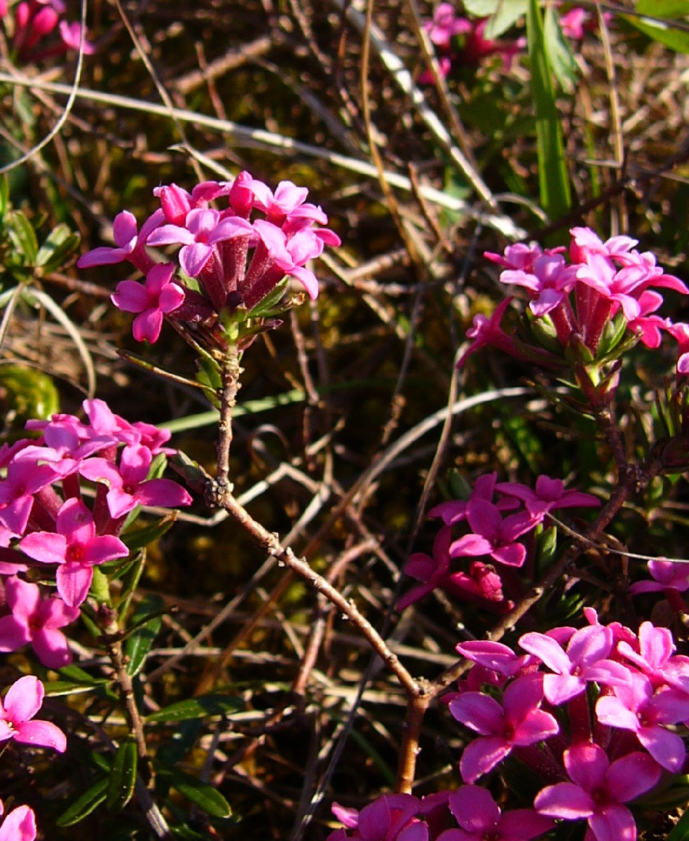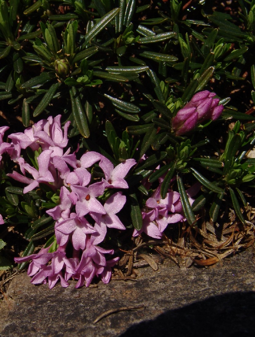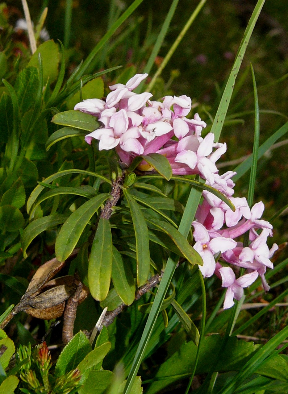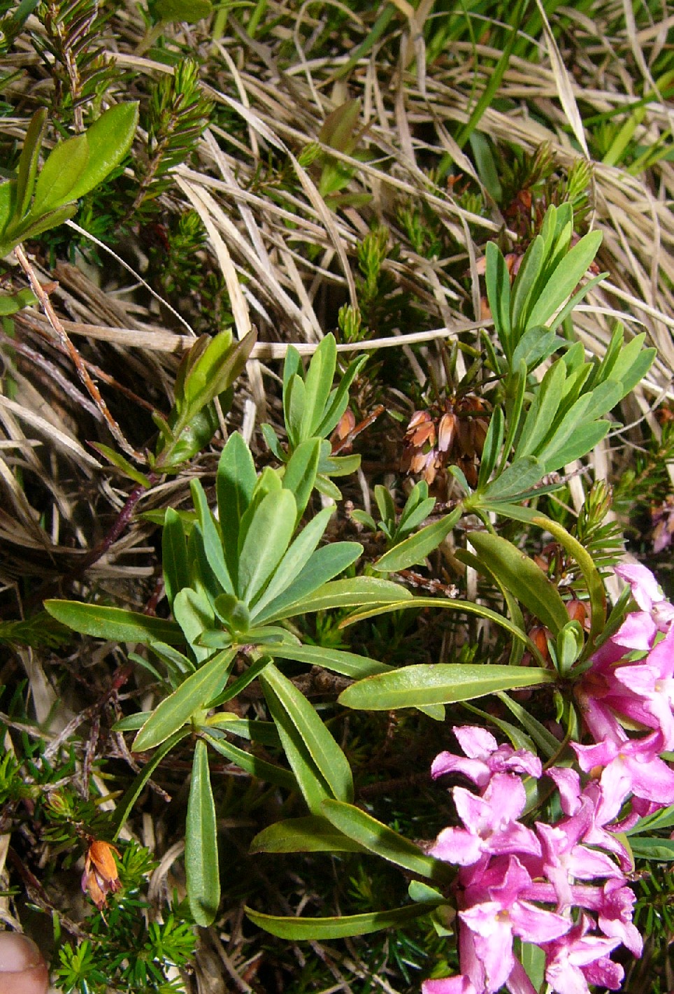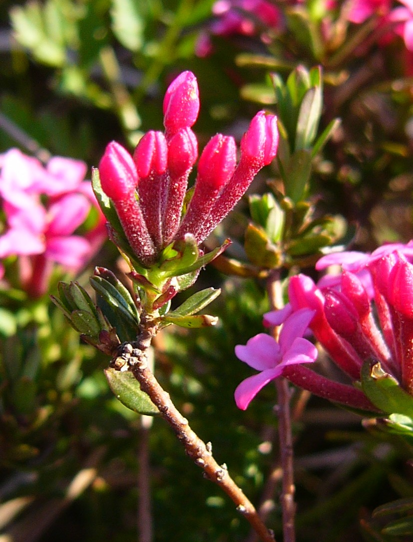 VII - VIII, Dolomitfelsen Synonyme: English name: Nome italiano: Weltweite Verbreitung: Etymologie: Bildet zusammen mit Daphne alpina den Bastard Daphne x reichsteinii und zusammen mit Daphne cneorum den Bastard Daphne x hendersonii Hodgkin ex C.D. Brickell & B. Mathew:
