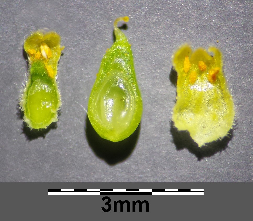 Frucht = ca. 3 mm lange birnenförmige Kapsel Stängel angedrückt behaart
