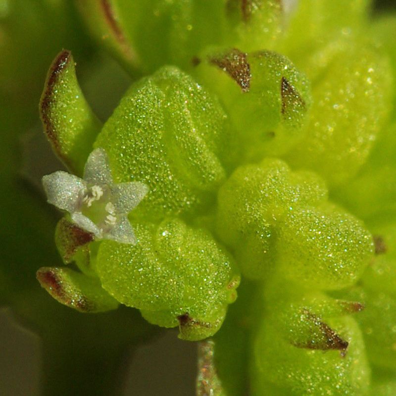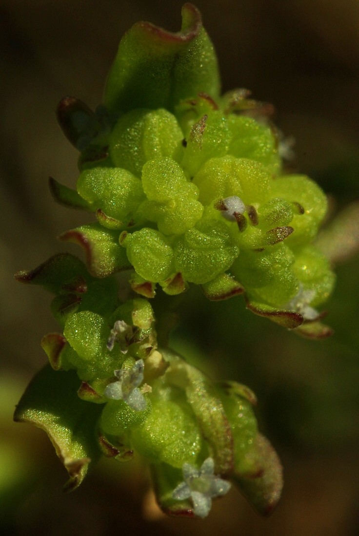 Blüten bläulich- weiß, sehr klein (2 mm) Früchte auf der Oberfläche papillös,