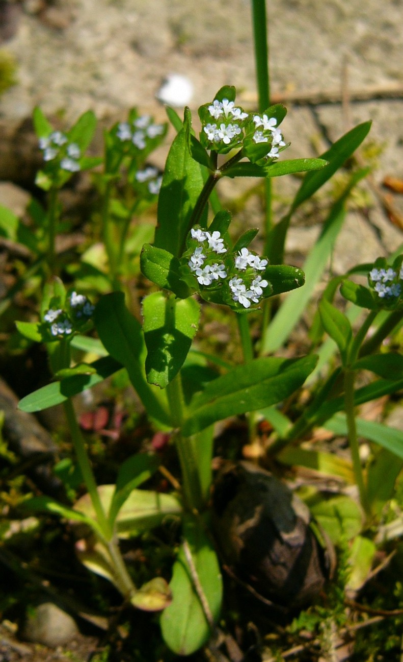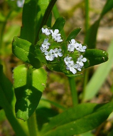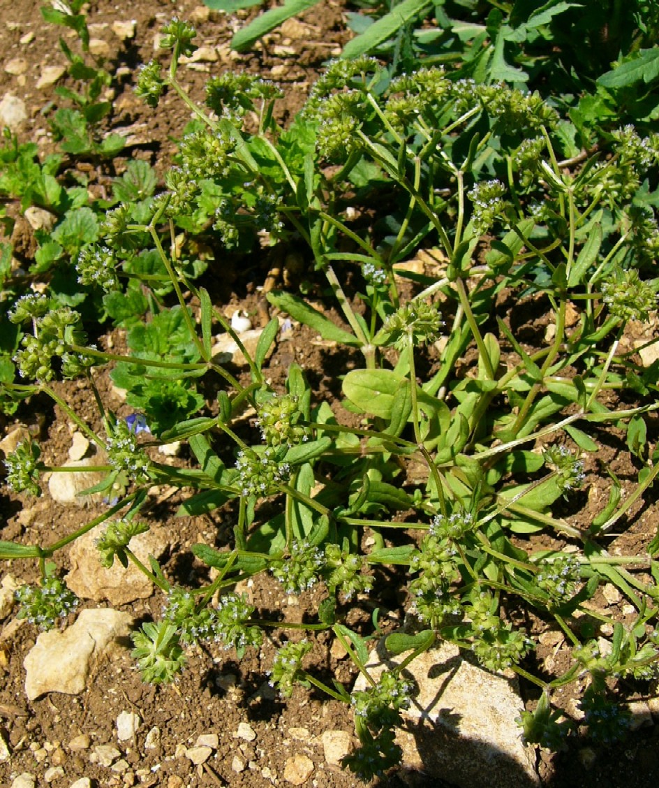 Pflanze 10 - 20 cm groß Blüten bläulich- weiß, sehr klein (2 mm) Früchte abgeflacht, gerillt