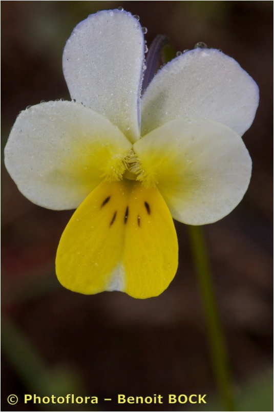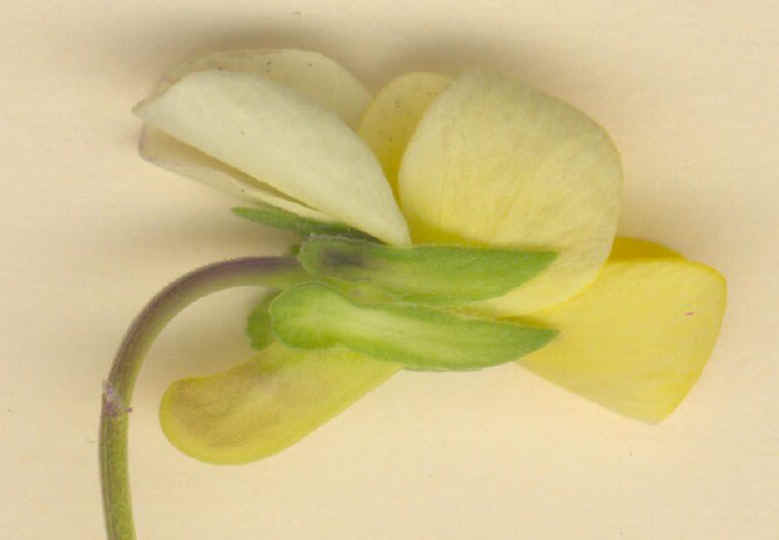 Blüten 10 - 20 mm hoch, 7 - 16 mm breit, obere und seitliche Kronblätter meist cremefarben oder bläulich, unteres Kronblatt leuchtend gelb
