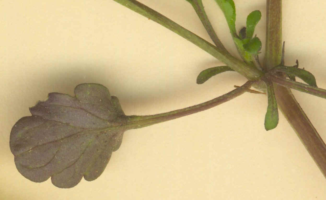 Untere Blätter lang gestielt, Blattspreite rundlich, beiderseits mit 2 - 3 Kerben, kahl oder am Rand kurz gewimpert