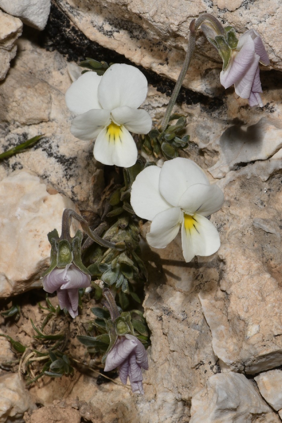 Blüten weiß oder cremefarben, im Schlund gelb, nur 4 - 7 mm hoch, mit oder ohne Strichzeichnung, unteres Kronblatt einschließlich Sporn 4 - 6 mm lang, Kronblätter kaum länger als die Kelchblätter, Sporn 1,5 mm lang, stumpf, kürzer als die ca. 1 mm langen Kelchanhängsel, Kelchblätter 3 - 6 mm lang, behaart