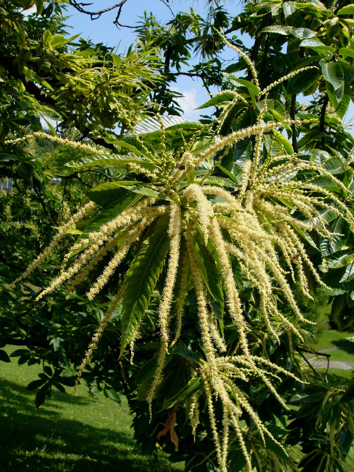Männliche Blüten weiß Frucht = Marone (Esskastanie), Fruchtbecher stachlig > Castanea sativa (Esskastanie)