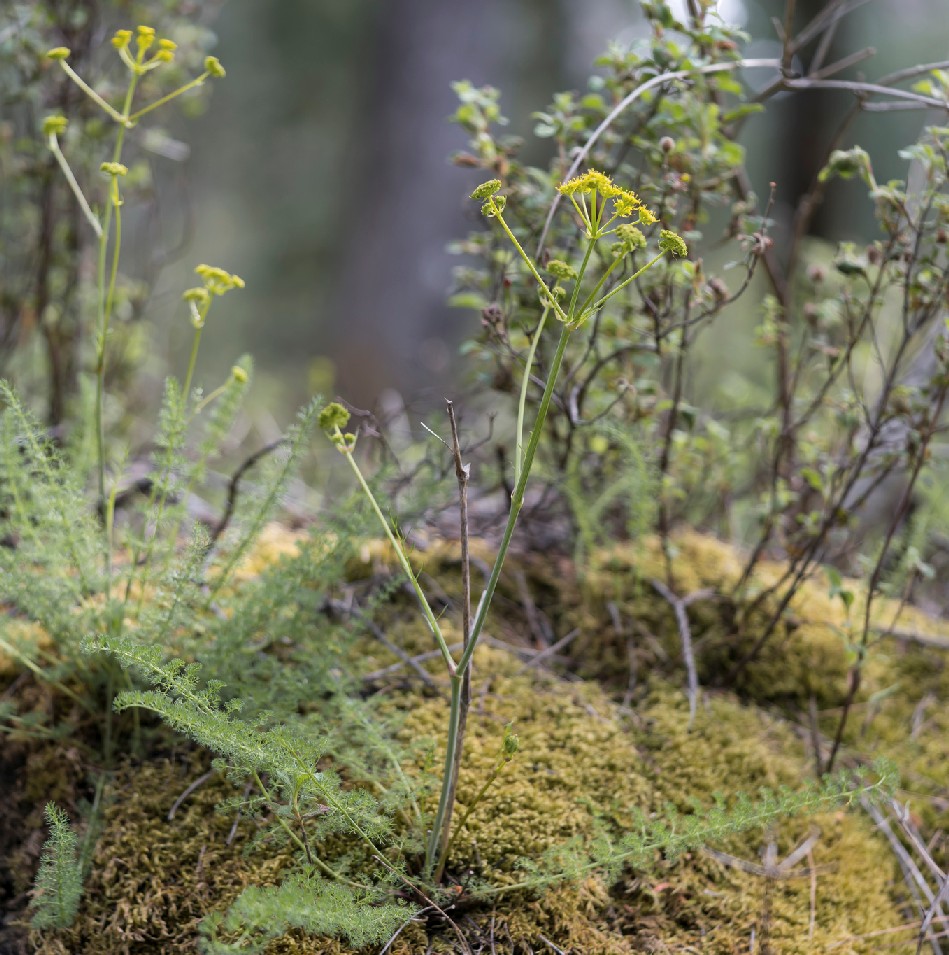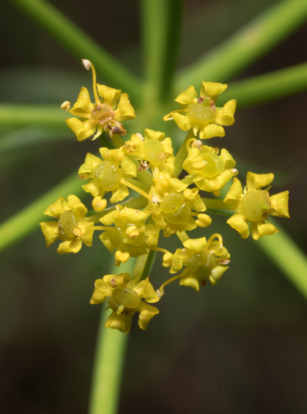 Döldchen dicht, Kronblätter dottergelb, nach innen gerollt, Kelchzähne winzig