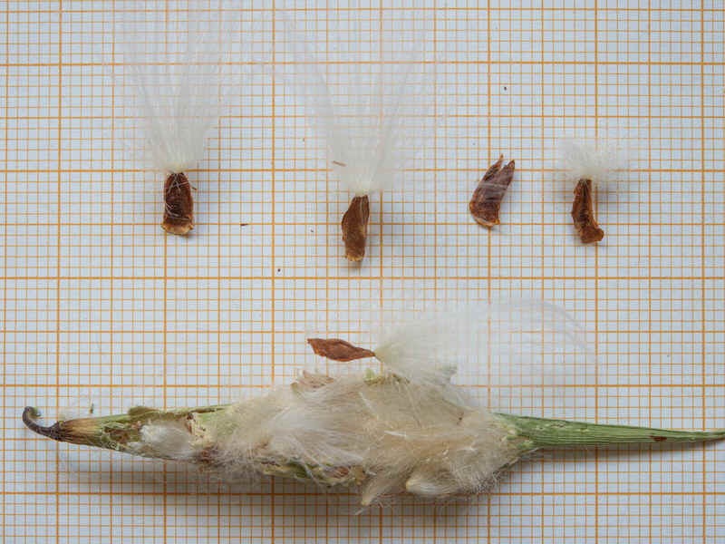 Frucht 5 - 7 cm lang, behaart, Samen mit einem bis 18 mm langen Haarschopf, mit dessen Hilfe sie sich als Schirmchenflieger ausbreiten Stängel rundum samtig behaart