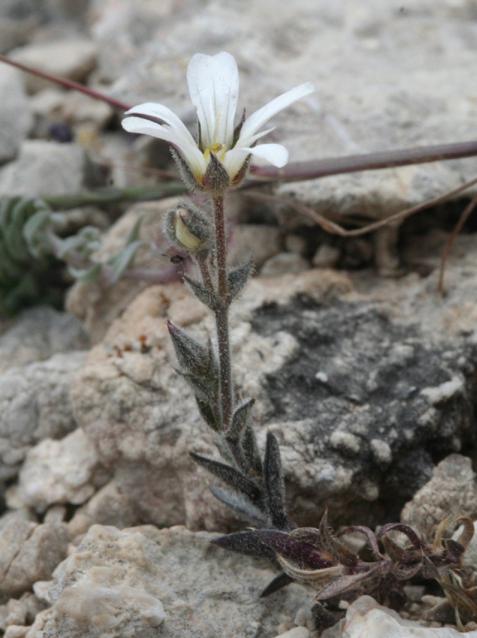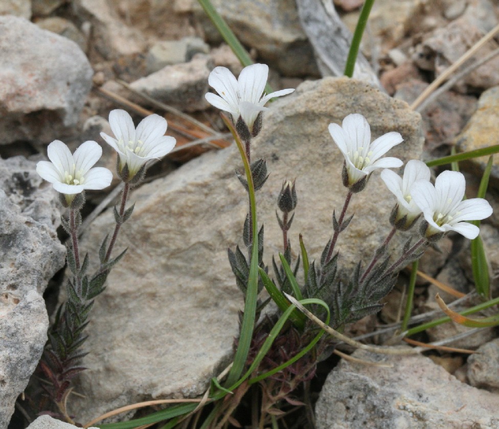 Blütenstand meist mit 2 - 4 Blüten, Blütenstiele mit 0,2 - 0,4 mm langen Drüsenhaaren, zur Fruchtzeit bis 10 mm lang, Blüten weiß, Kronblätter 5 - 10 mm lang, vorne abgerundet, länger als die Kelchblätter, Kelchblätter eilanzettlich 3,5 - 4,5 mm lang, dicht drüsig langhaarig