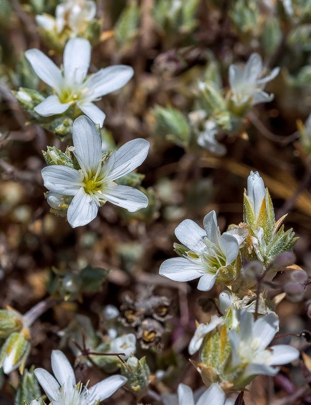 Blüten weiß, zwittrig, 5 Kronblätter, 3 Griffel, 8 - 10 Staubblätter, Kronblätter 5 - 6 mm lang, länger als die Kelchblätter,