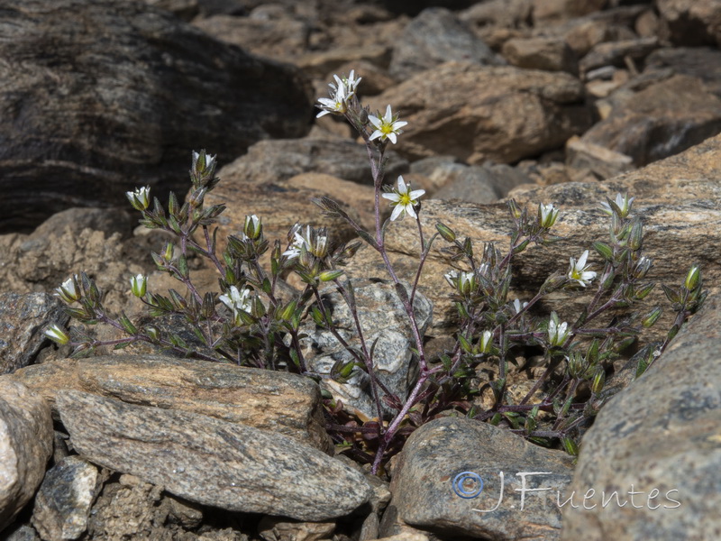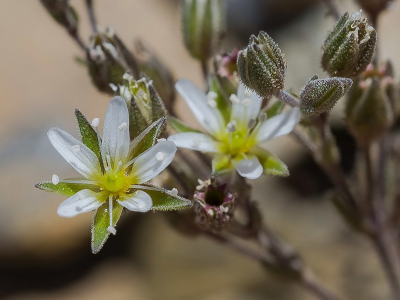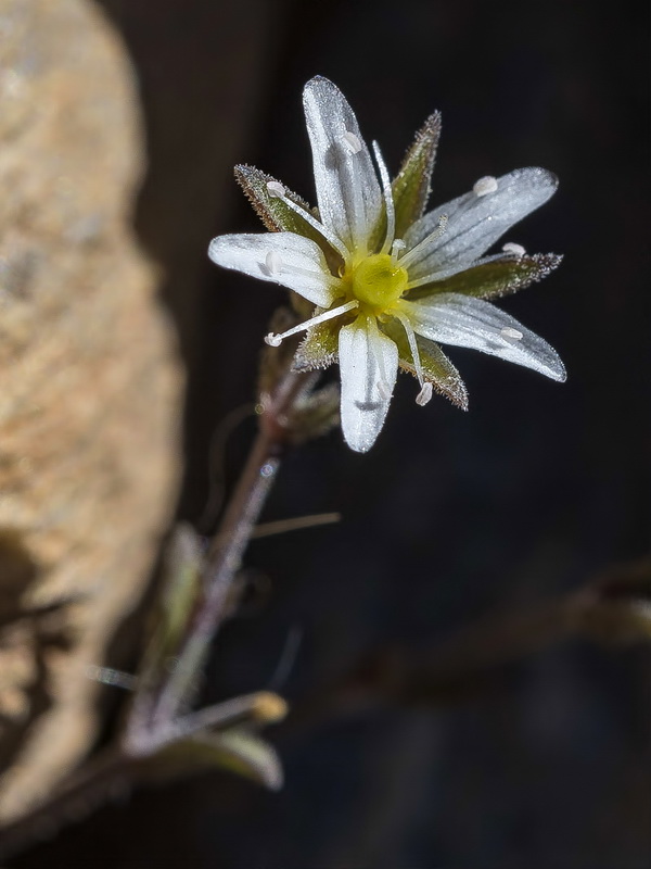 Blüten weiß, sternförmig, Kronblätter 4 mm lang, schmal, wenig länger die Kelchblätter, nicht deckend, Staubblätter ca. so lang wie der Kelch, Antheren 0,5 mm