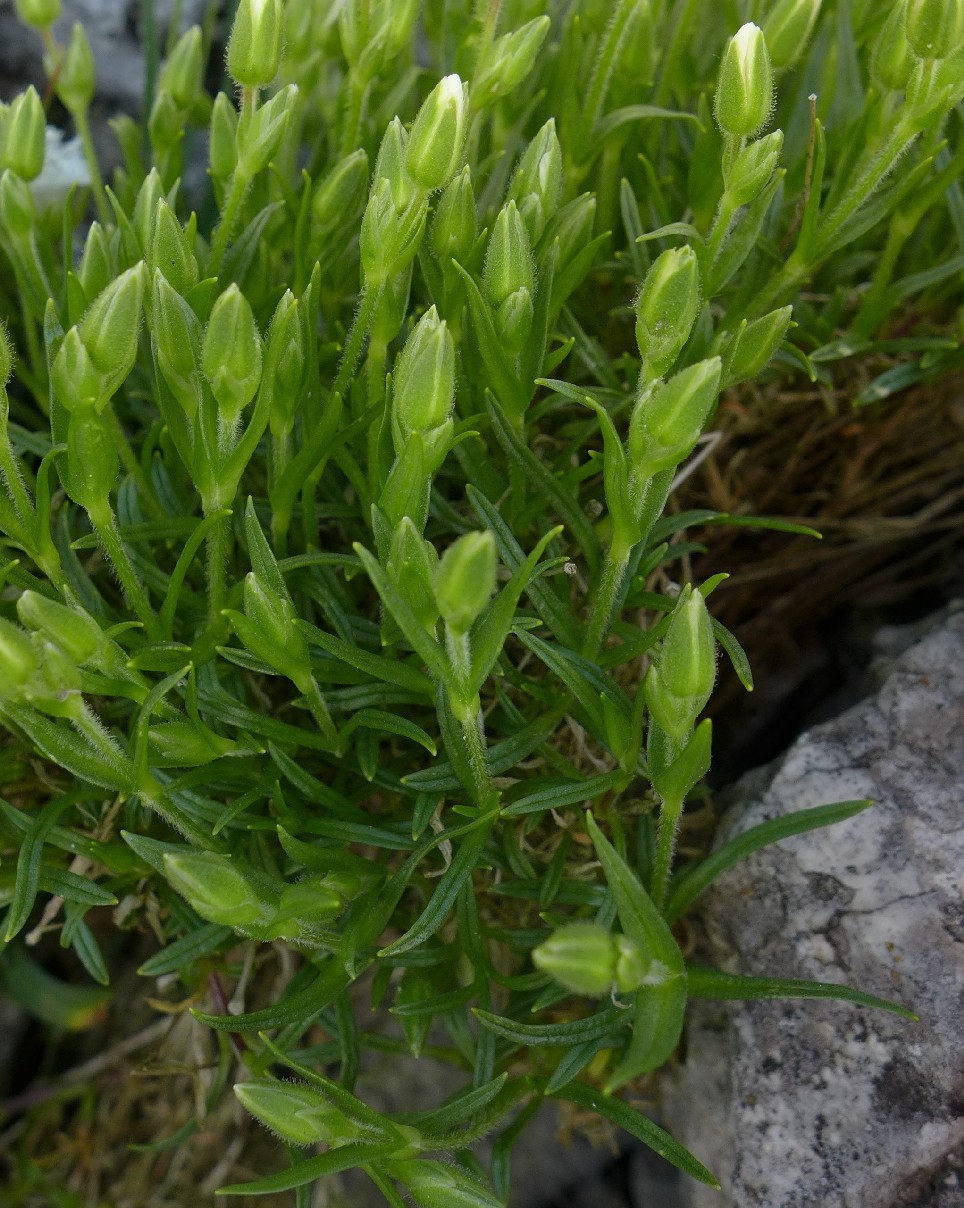 10 Zähnen aufspringend Stängel drüsig behaart, Blätter lanzettlich 4 - 10 mm lang, 1 -3 mm breit, behaart, am Rand bewimpert, dachziegelig deckend, mit Blattbüscheln in den Blattachseln