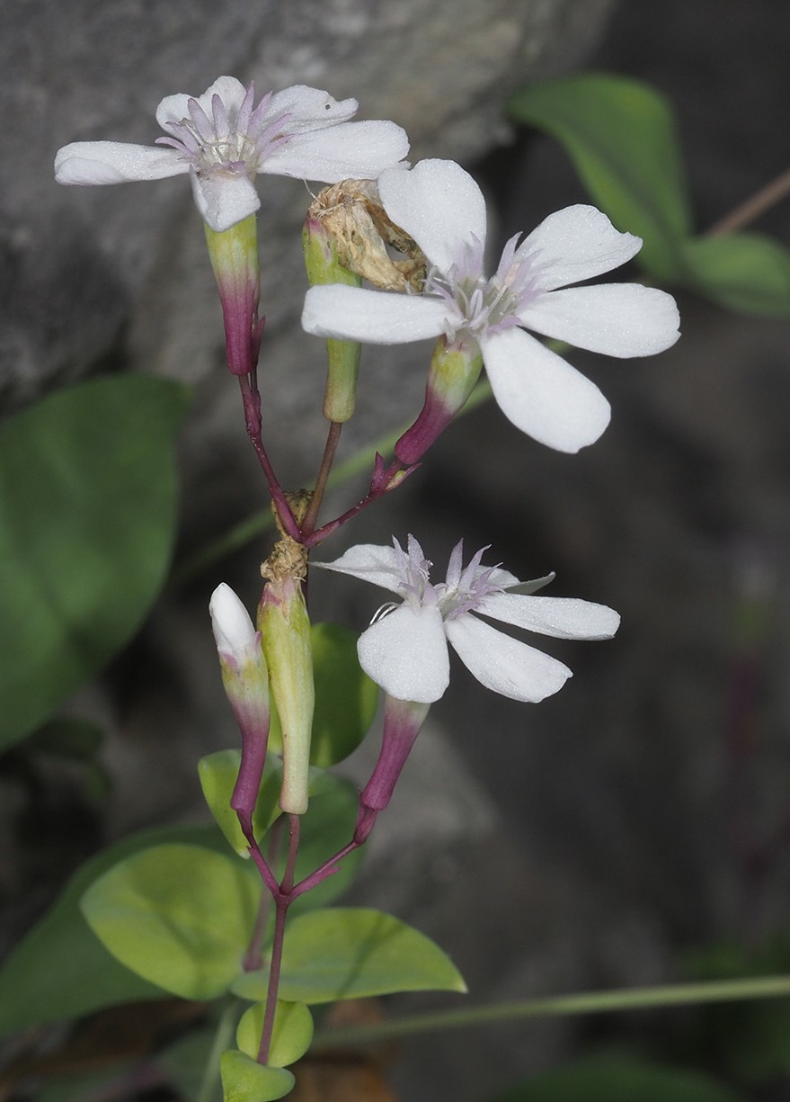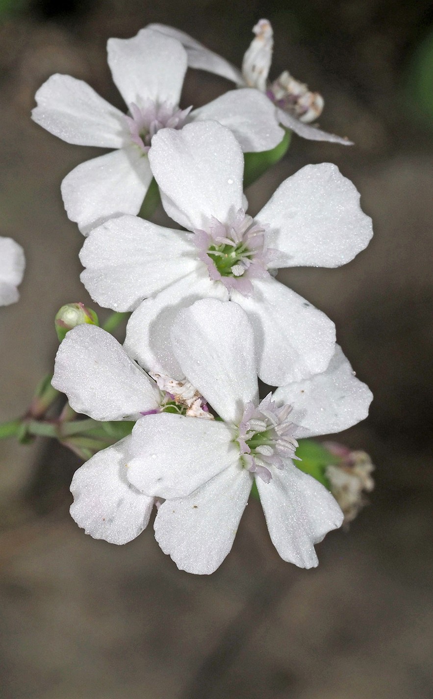 Blüten weiß oder hellrosa, in Platte und Nagel gegliedert, zwittrig, 5 Kronblätter, 10 Staubblätter, 5 Griffel, mit Nebenkrone, vorne gezähnelt