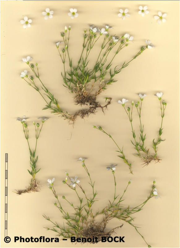 Arenaria - Blüten weiß, 5 Kronblätter, Kronblätter spatelig, vorne abgerundet, 5 - 10 mm lang, länger als die Kelchblätter, Blätter linealisch