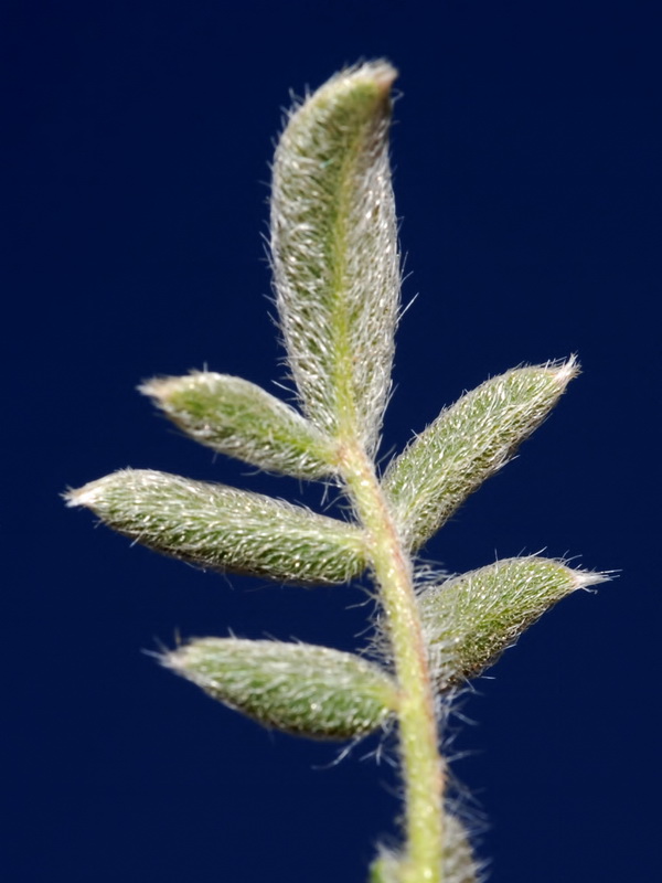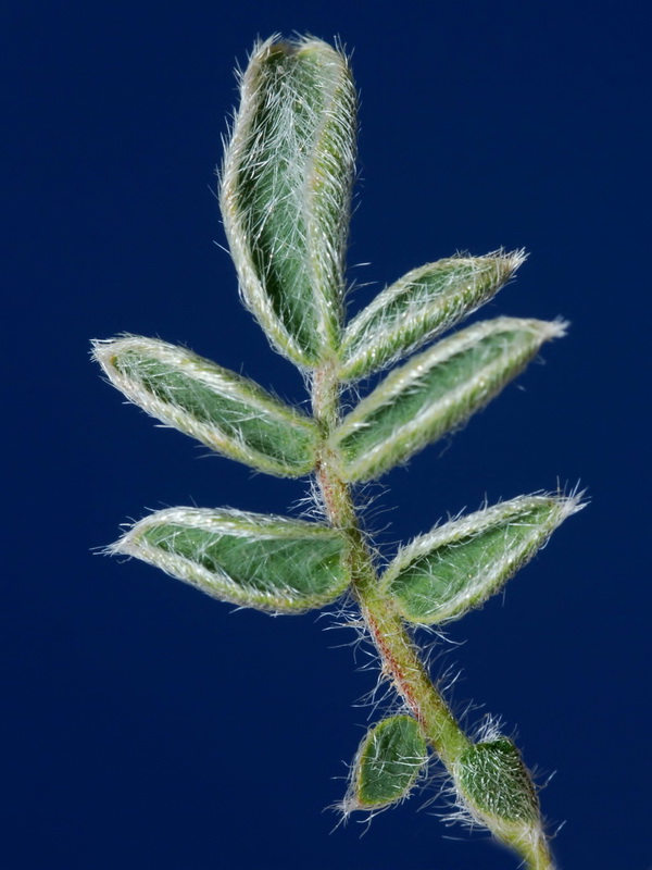 mit 5 lanzettlichen Blättchen, Untere Blätter mit 5 - 7 Blättchen, Endblättchen elliptisch, 12 - 8 mm lang, maximal doppelt so groß wie die seitlichen Blättchen, Blättchenoberseite kahl