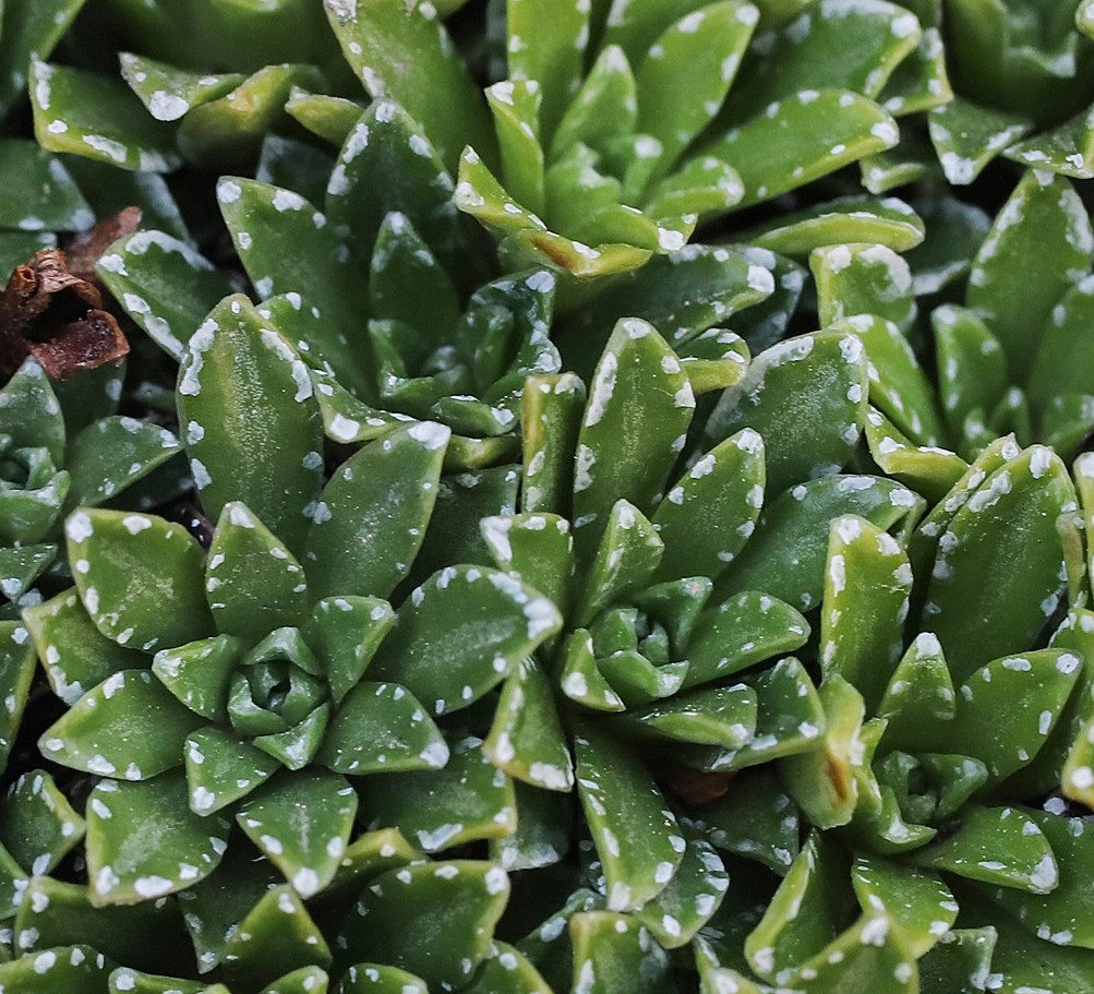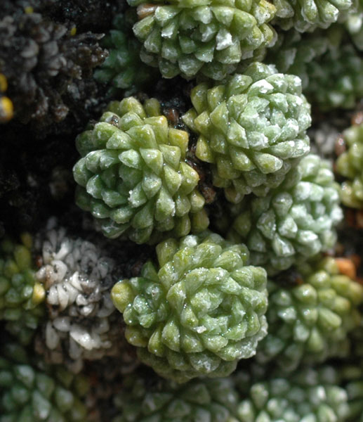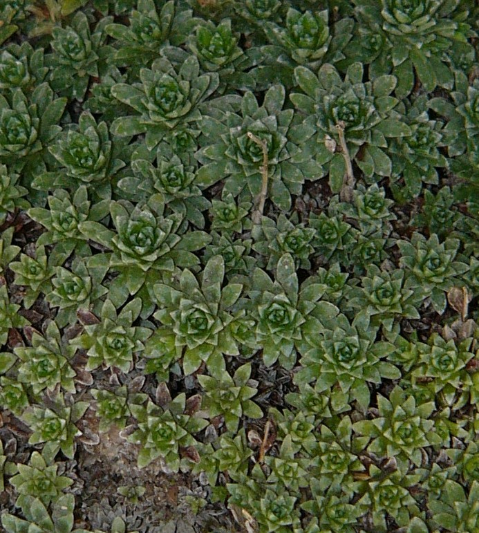 Grundblätter rosettig, dachziegelartig, lanzettlich oder dreieckig, 3 - 12 mm lang, 2 - 5 mm breit, spitz oder stumpf, hart, nicht zurückgebogen, ohne Stachelspitze