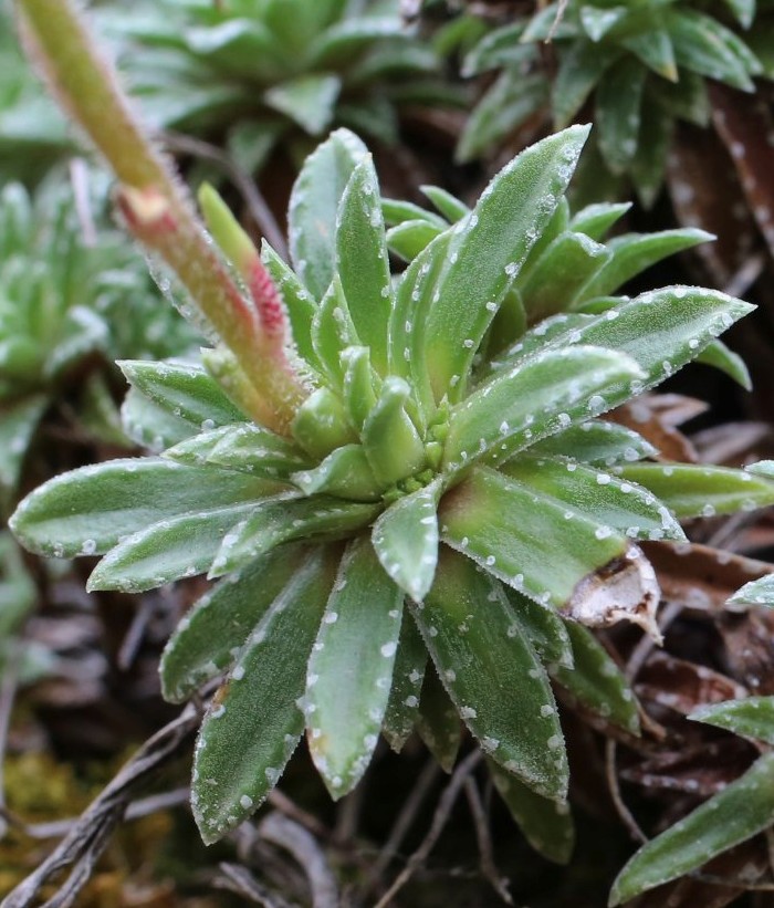 Grundblätter rosettig, dachziegelartig, lanzettlich, 5 - 14 mm lang, 2 - 4 mm breit, spitz, am Rücken gekielt, am Rand gezähnelt, hart, Blätter mit kalkausscheidenden Grübchen