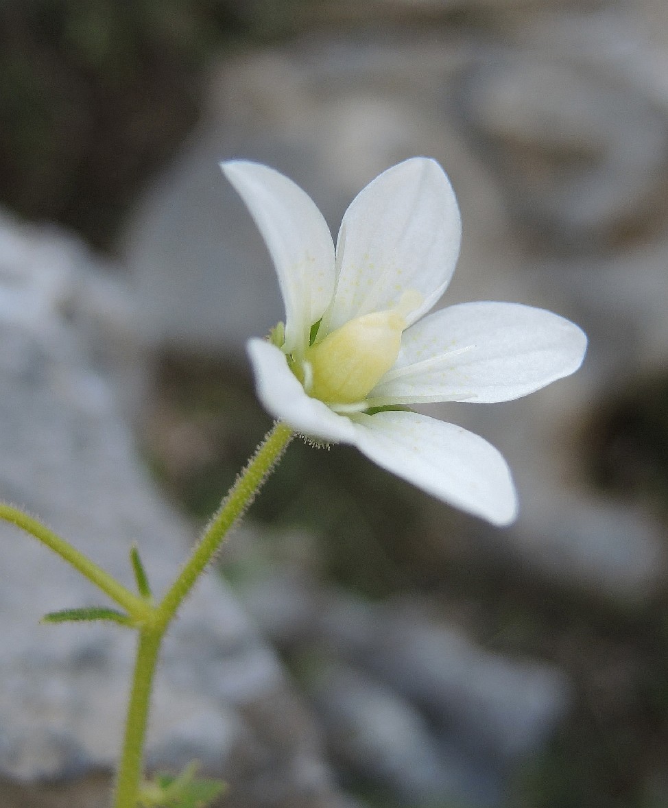 Kronblätter 5 - 9 mm langweiß, mit roten und am Grund mit gelben Punkten