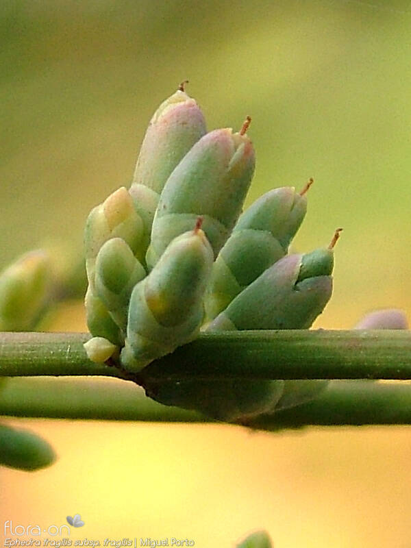 Weibliche Zapfen mit 1 - 2 mandelförmigen Samenanlagen, an deren Spitze sich ein 1 - 3 mm langer Mikropylartubus ("Griffel") befindet, die Samenanlagen werden von von 2 - 3 Paar anfangs grünen Hochblättern umgeben