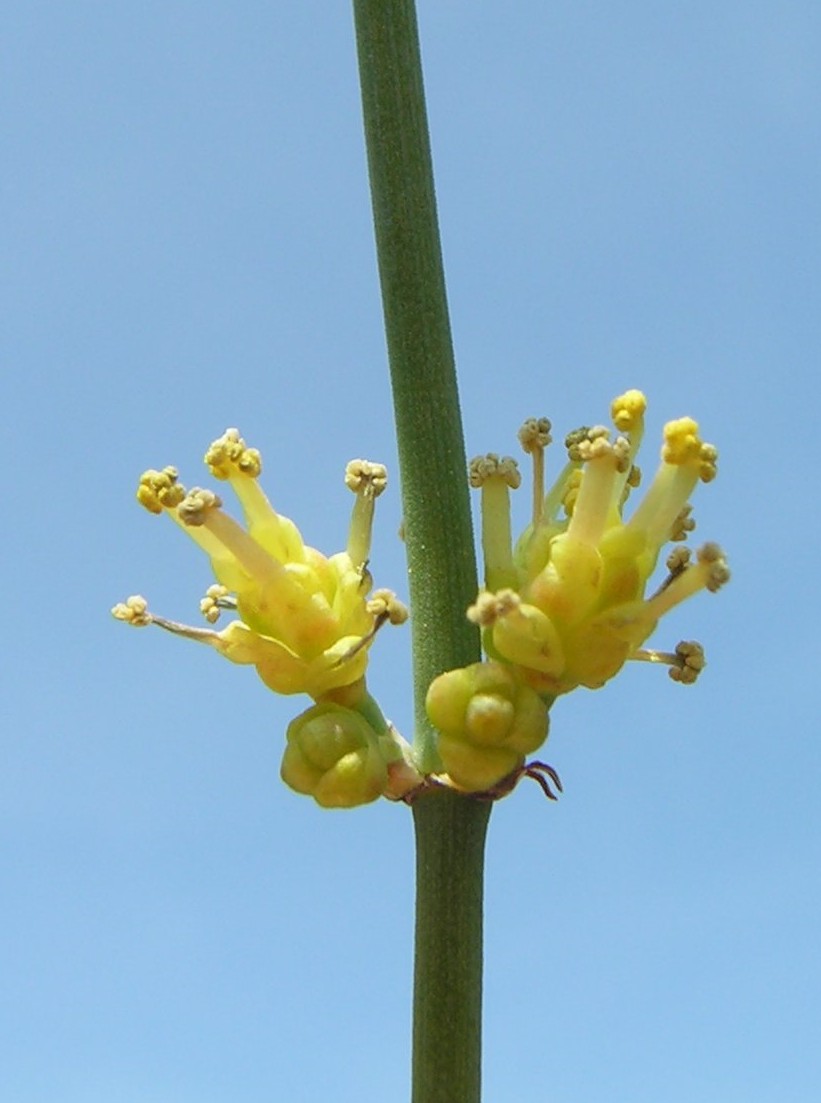 Männlichen Zapfen mit 2 - 4 Paar Blüten, die aus Hochblättern und Säulen mit 4 - 6 Mikrosporangien (ähnlich einem Staubblatt) bestehen, Mikrosporangien öffnen mit 2 Poren