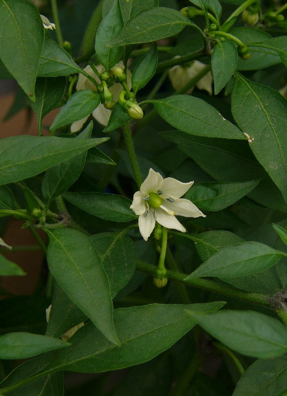 Früchte = Chilis, Paprika Blüten einzeln oder zu 2 - 5 büschelig Blätter eilanzettlich, > Paprika (Capsicum) |