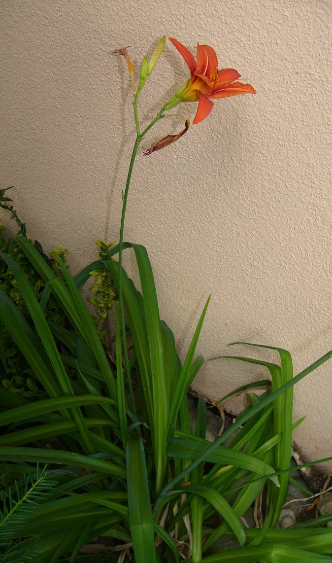 Blüten Blüten ziegelrot, aufrecht Stängel nur mit kleinen Hochblättern > Rotgelbe Taglilie (Hemerocallis fulva)