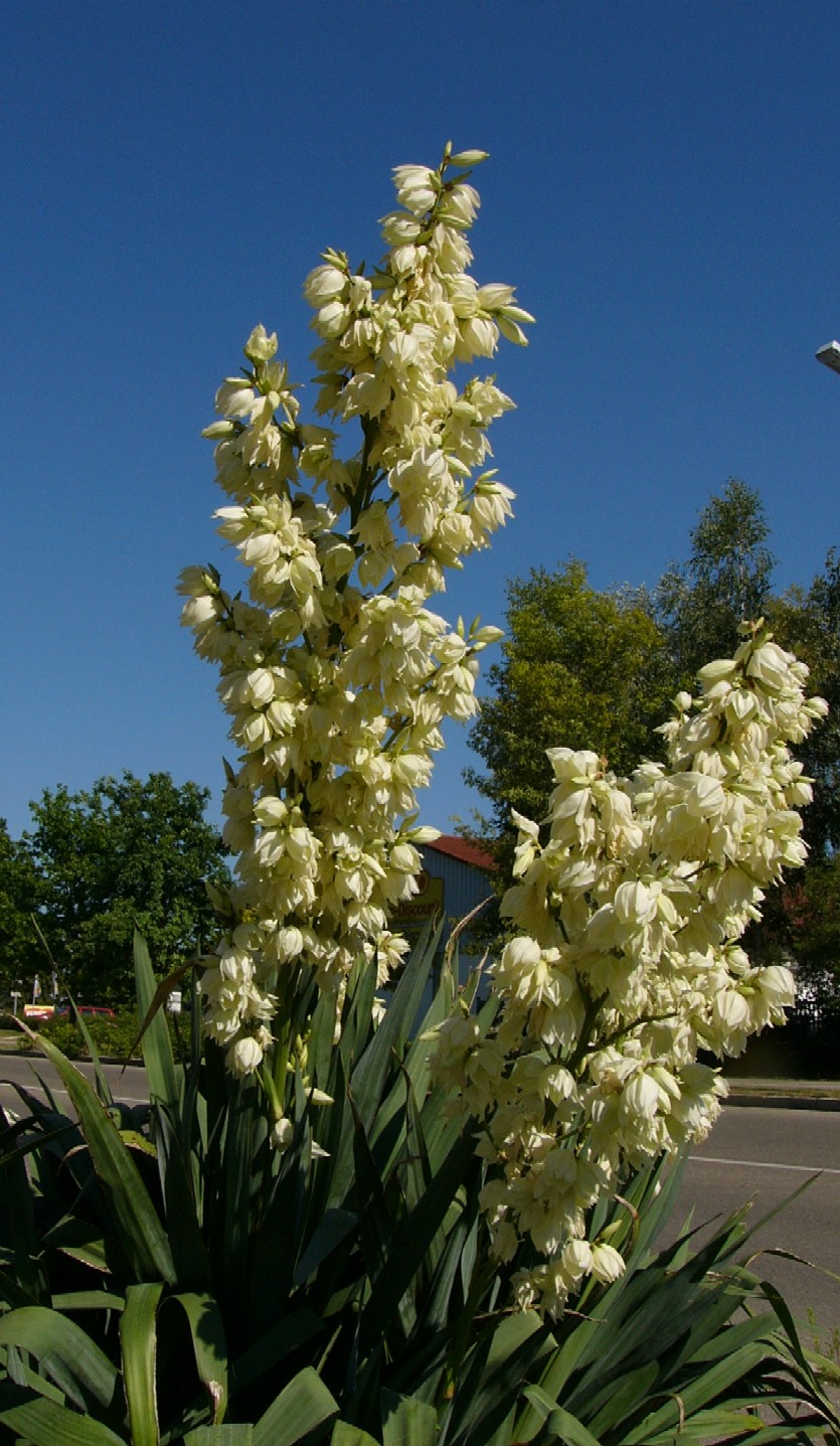 | Blütenstand endständig, bis 2,50 m hoch, Blätter grundständig, rosettig, bis 1 m lang > Yucca (Palmlilie)